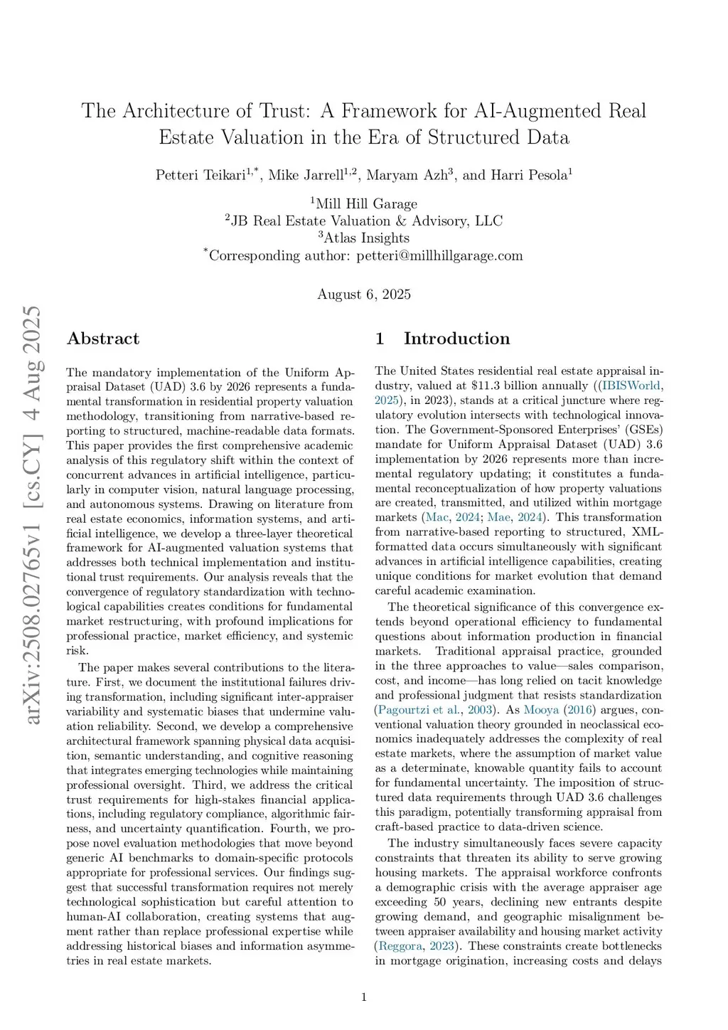 The Uniform Appraisal Dataset (UAD) 3.6's mandatory 2026 implementation transforms residential property valuation from narrative reporting to structured, machine-readable formats. This paper provides the first comprehensive analysis of this regulatory shift alongside concurrent AI advances in computer vision, natural language processing, and autonomous systems. We develop a three-layer framework for AI-augmented valuation addressing technical implementation and institutional trust requirements. Our analysis reveals how regulatory standardization converging with AI capabilities enables fundamental market restructuring with profound implications for professional practice, efficiency, and systemic risk. We make four key contributions: (1) documenting institutional failures including inter-appraiser variability and systematic biases undermining valuation reliability; (2) developing an architectural framework spanning physical data acquisition, semantic understanding, and cognitive reasoning that integrates emerging technologies while maintaining professional oversight; (3) addressing trust requirements for high-stakes financial applications including regulatory compliance, algorithmic fairness, and uncertainty quantification; (4) proposing evaluation methodologies beyond generic AI benchmarks toward domain-specific protocols. Our findings indicate successful transformation requires not merely technological sophistication but careful human-AI collaboration, creating systems that augment rather than replace professional expertise while addressing historical biases and information asymmetries in real estate markets.