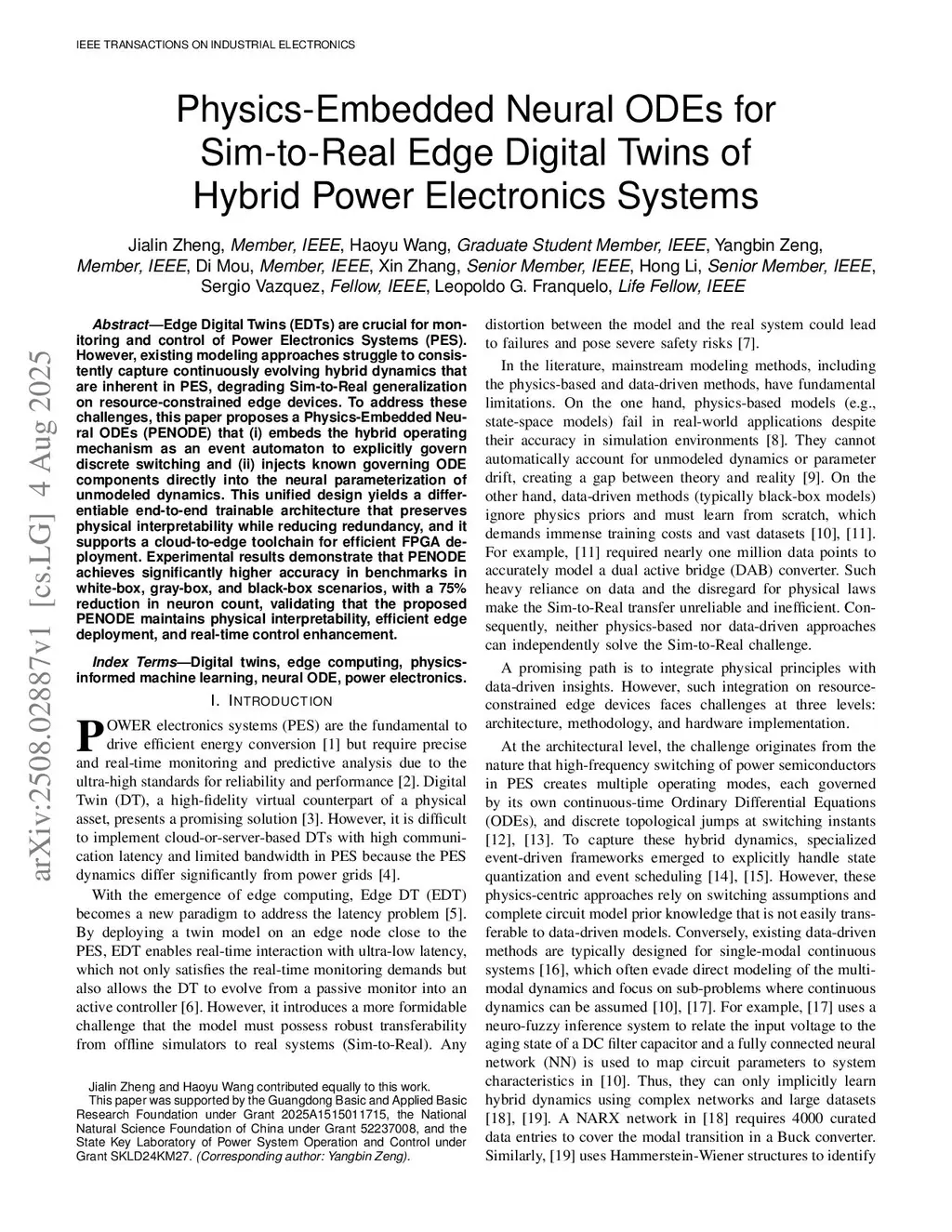 Edge Digital Twins (EDTs) are crucial for monitoring and control of Power Electronics Systems (PES). However, existing modeling approaches struggle to consistently capture continuously evolving hybrid dynamics that are inherent in PES, degrading Sim-to-Real generalization on resource-constrained edge devices. To address these challenges, this paper proposes a Physics-Embedded Neural ODEs (PENODE) that (i) embeds the hybrid operating mechanism as an event automaton to explicitly govern discrete switching and (ii) injects known governing ODE components directly into the neural parameterization of unmodeled dynamics. This unified design yields a differentiable end-to-end trainable architecture that preserves physical interpretability while reducing redundancy, and it supports a cloud-to-edge toolchain for efficient FPGA deployment. Experimental results demonstrate that PENODE achieves significantly higher accuracy in benchmarks in white-box, gray-box, and black-box scenarios, with a 75% reduction in neuron count, validating that the proposed PENODE maintains physical interpretability, efficient edge deployment, and real-time control enhancement.