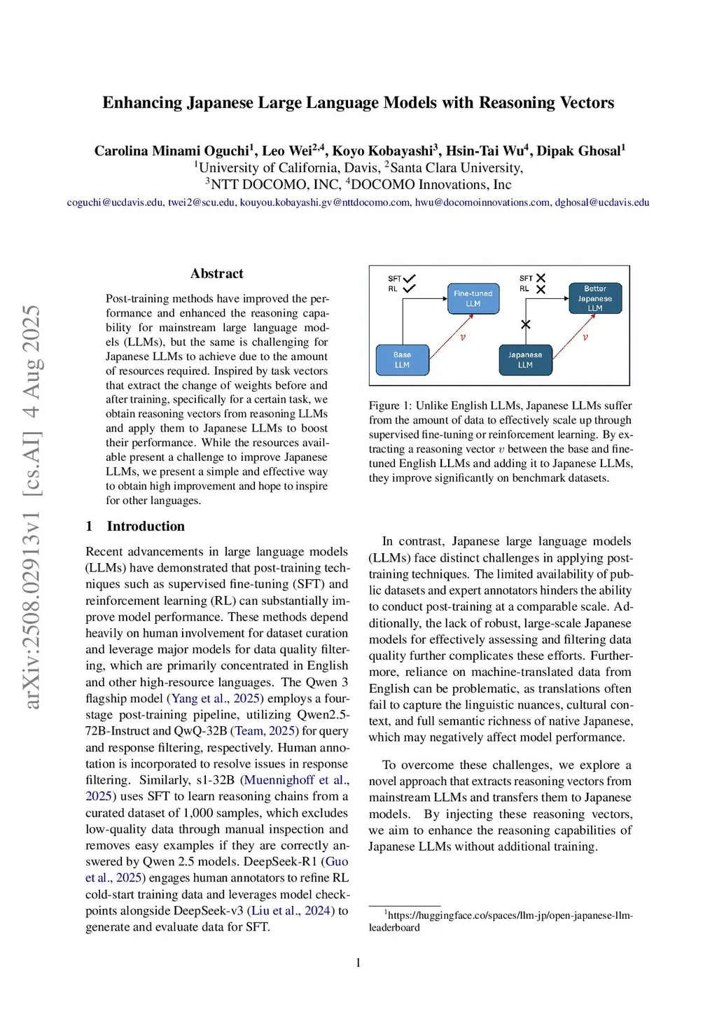 Enhancing Japanese Large Language Models with Reasoning Vectors