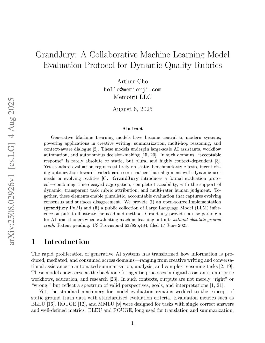 Generative Machine Learning models have become central to modern systems, powering applications in creative writing, summarization, multi-hop reasoning, and context-aware dialogue. These models underpin large-scale AI assistants, workflow automation, and autonomous decision-making. In such domains, acceptable response is rarely absolute or static, but plural and highly context-dependent. Yet standard evaluation regimes still rely on static, benchmark-style tests, incentivizing optimization toward leaderboard scores rather than alignment with dynamic user needs or evolving realities. GrandJury introduces a formal evaluation protocol combining time-decayed aggregation, complete traceability, with the support of dynamic, transparent task rubric attribution, and multi-rater human judgment. Together, these elements enable pluralistic, accountable evaluation that captures evolving consensus and surfaces disagreement. We provide an open-source implementation (grandjury PyPI package) and a public collection of Large Language Model (LLM) inference outputs to illustrate the need and method. GrandJury provides a new paradigm for AI practitioners when evaluating machine learning outputs without absolute ground truth.