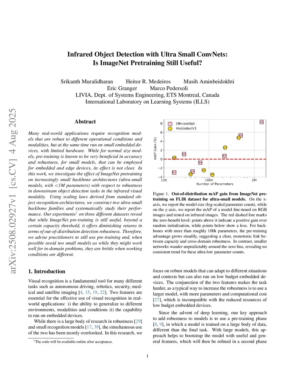 Many real-world applications require recognition models that are robust to different operational conditions and modalities, but at the same time run on small embedded devices, with limited hardware. While for normal size models, pre-training is known to be very beneficial in accuracy and robustness, for small models, that can be employed for embedded and edge devices, its effect is not clear. In this work, we investigate the effect of ImageNet pretraining on increasingly small backbone architectures (ultra-small models, with less than 1M parameters) with respect to robustness in downstream object detection tasks in the infrared visual modality. Using scaling laws derived from standard object recognition architectures, we construct two ultra-small backbone families and systematically study their performance. Our experiments on three different datasets reveal that while ImageNet pre-training is still useful, beyond a certain capacity threshold, it offers diminishing returns in terms of out-of-distribution detection robustness. Therefore, we advise practitioners to still use pre-training and, when possible avoid too small models as while they might work well for in-domain problems, they are brittle when working conditions are different.