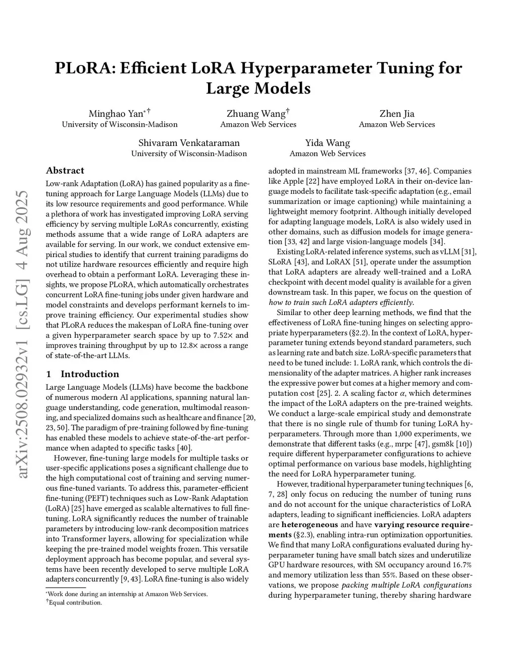 PLoRA: Efficient LoRA Hyperparameter Tuning for Large Models