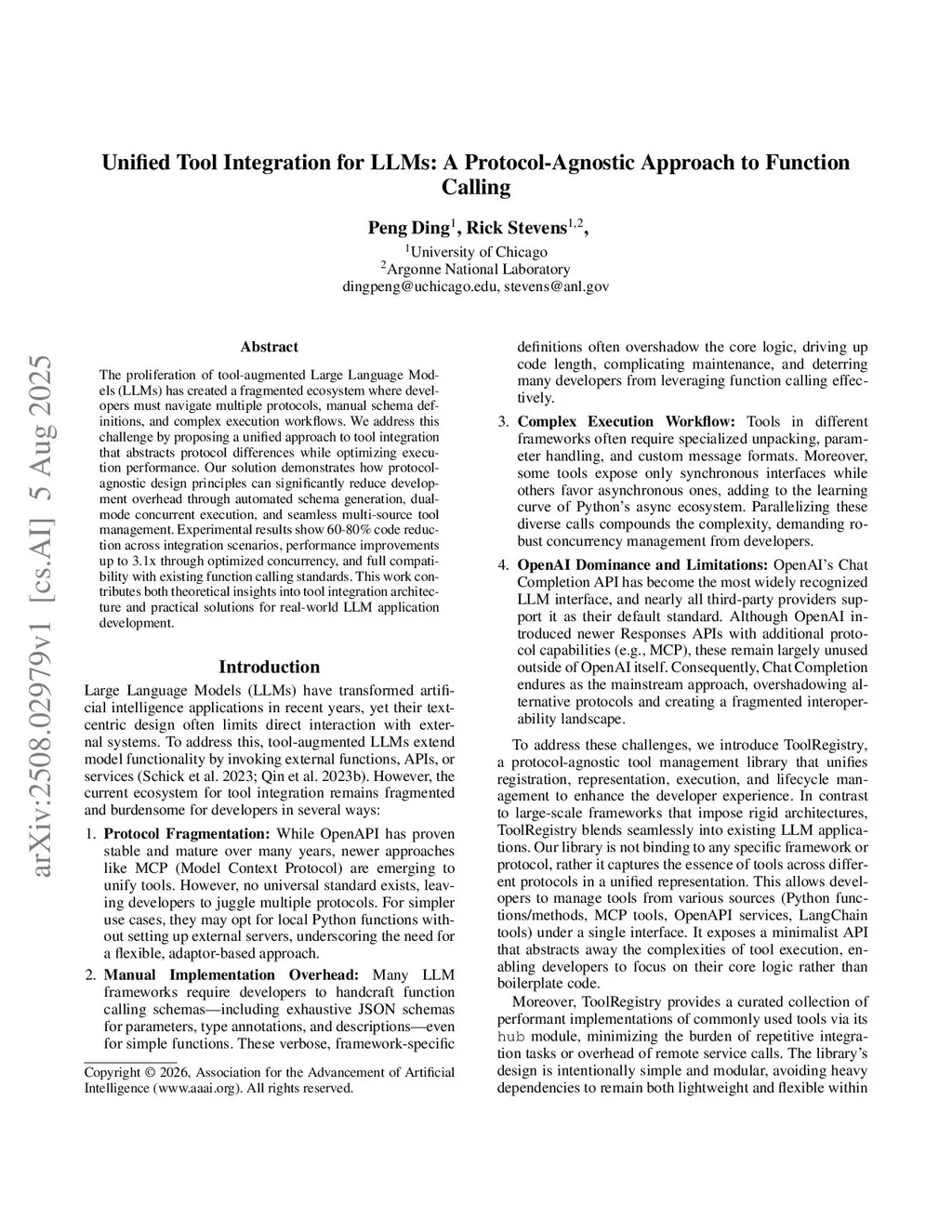 The proliferation of tool-augmented Large Language Models (LLMs) has created a fragmented ecosystem where developers must navigate multiple protocols, manual schema definitions, and complex execution workflows. We address this challenge by proposing a unified approach to tool integration that abstracts protocol differences while optimizing execution performance. Our solution demonstrates how protocol-agnostic design principles can significantly reduce development overhead through automated schema generation, dual-mode concurrent execution, and seamless multi-source tool management. Experimental results show 60-80% code reduction across integration scenarios, performance improvements up to 3.1x through optimized concurrency, and full compatibility with existing function calling standards. This work contributes both theoretical insights into tool integration architecture and practical solutions for real-world LLM application development.