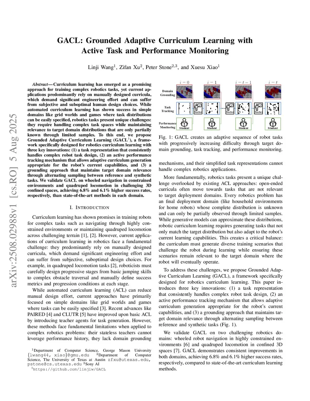 GACL: Grounded Adaptive Curriculum Learning with Active Task and Performance Monitoring