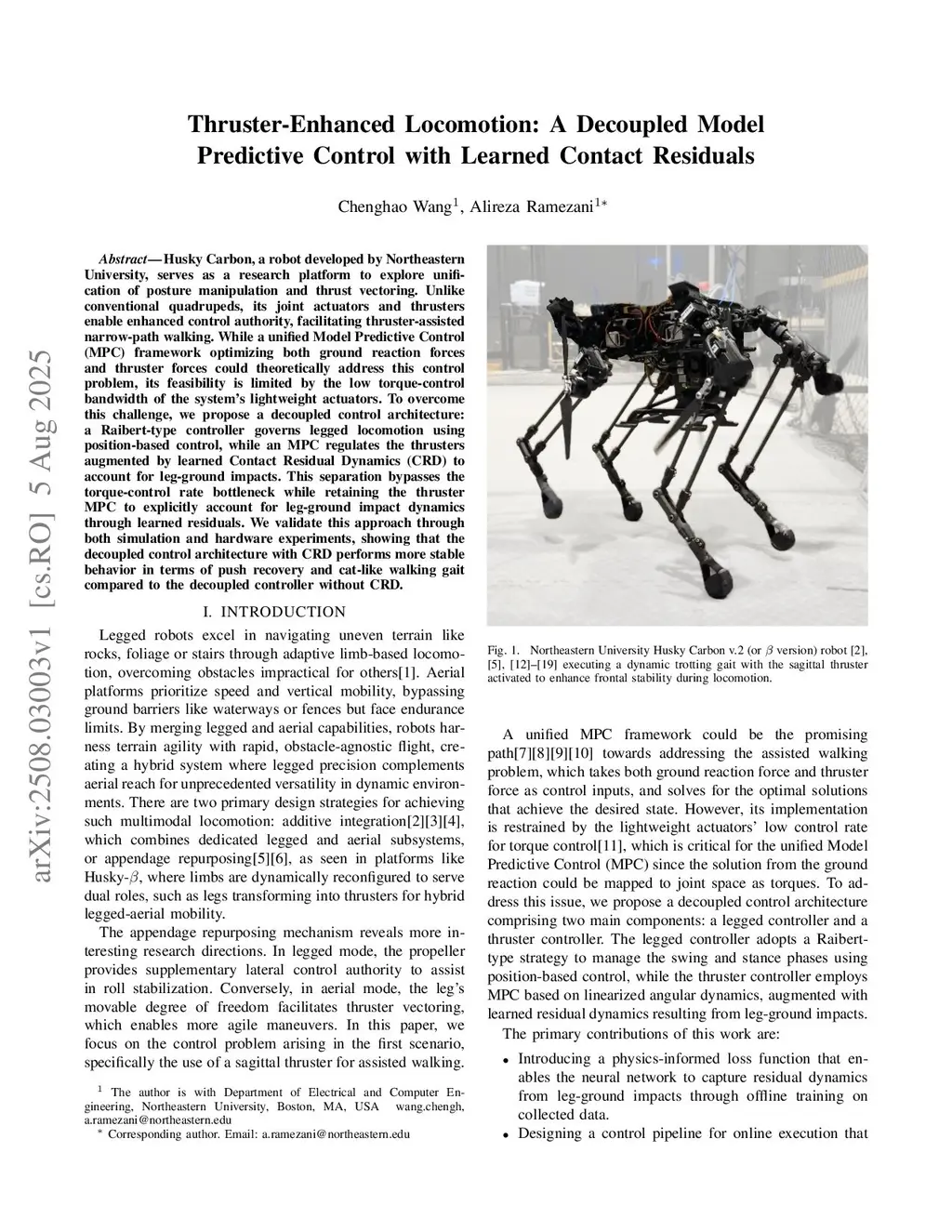 Husky Carbon, a robot developed by Northeastern University, serves as a research platform to explore unification of posture manipulation and thrust vectoring. Unlike conventional quadrupeds, its joint actuators and thrusters enable enhanced control authority, facilitating thruster-assisted narrow-path walking. While a unified Model Predictive Control (MPC) framework optimizing both ground reaction forces and thruster forces could theoretically address this control problem, its feasibility is limited by the low torque-control bandwidth of the system's lightweight actuators. To overcome this challenge, we propose a decoupled control architecture: a Raibert-type controller governs legged locomotion using position-based control, while an MPC regulates the thrusters augmented by learned Contact Residual Dynamics (CRD) to account for leg-ground impacts. This separation bypasses the torque-control rate bottleneck while retaining the thruster MPC to explicitly account for leg-ground impact dynamics through learned residuals. We validate this approach through both simulation and hardware experiments, showing that the decoupled control architecture with CRD performs more stable behavior in terms of push recovery and cat-like walking gait compared to the decoupled controller without CRD.