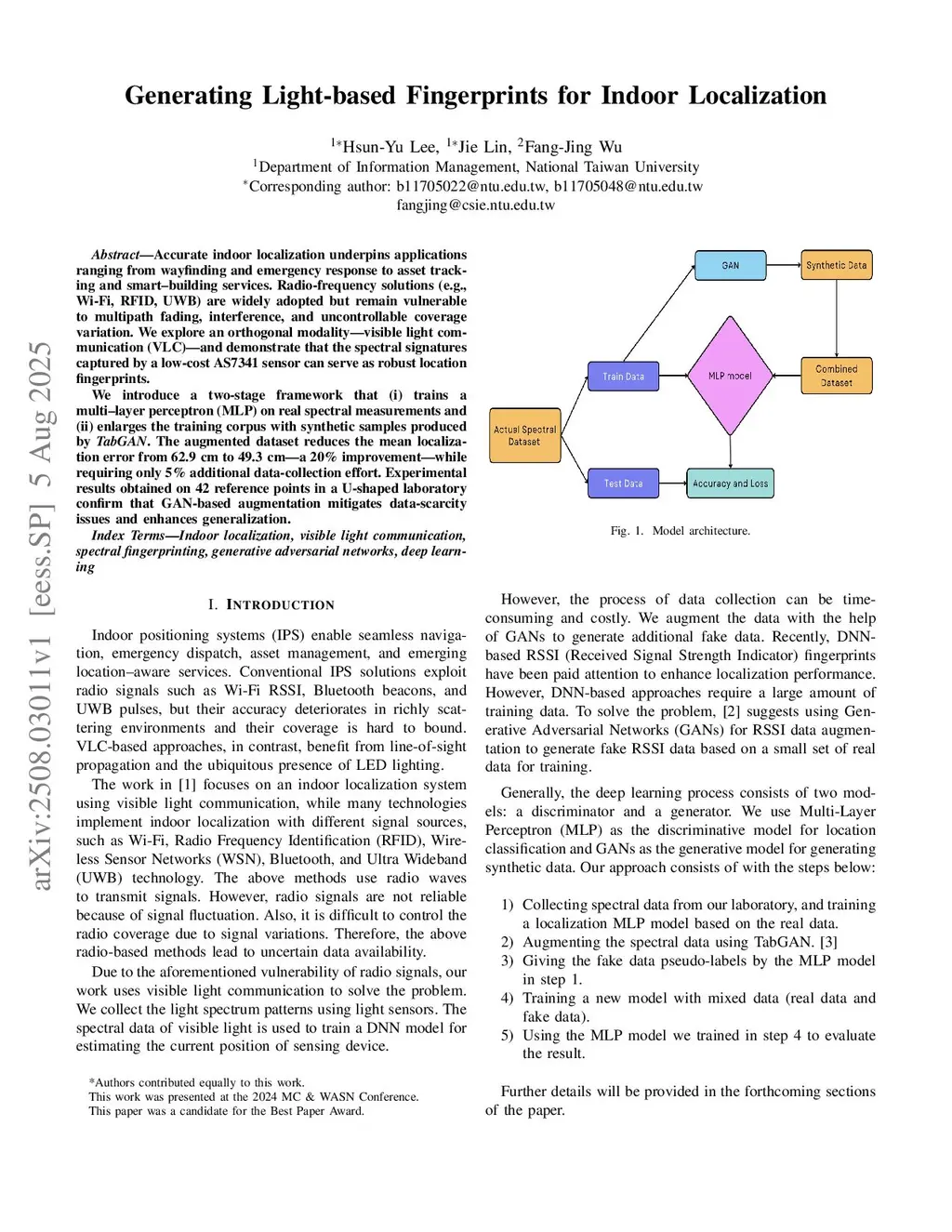 Accurate indoor localization underpins applications ranging from wayfinding and emergency response to asset tracking and smart-building services. Radio-frequency solutions (e.g. Wi-Fi, RFID, UWB) are widely adopted but remain vulnerable to multipath fading, interference, and uncontrollable coverage variation. We explore an orthogonal modality -- visible light communication (VLC) -- and demonstrate that the spectral signatures captured by a low-cost AS7341 sensor can serve as robust location fingerprints.We introduce a two-stage framework that (i) trains a multi-layer perceptron (MLP) on real spectral measurements and (ii) enlarges the training corpus with synthetic samples produced by TabGAN. The augmented dataset reduces the mean localization error from 62.9cm to 49.3cm -- a 20% improvement -- while requiring only 5% additional data-collection effort. Experimental results obtained on 42 reference points in a U-shaped laboratory confirm that GAN-based augmentation mitigates data-scarcity issues and enhances generalization.