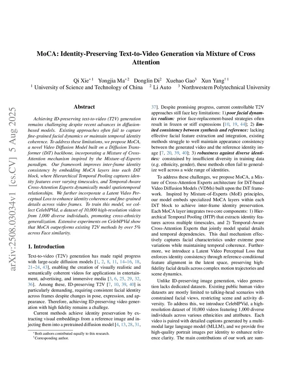 Achieving ID-preserving text-to-video (T2V) generation remains challenging despite recent advances in diffusion-based models. Existing approaches often fail to capture fine-grained facial dynamics or maintain temporal identity coherence. To address these limitations, we propose MoCA, a novel Video Diffusion Model built on a Diffusion Transformer (DiT) backbone, incorporating a Mixture of Cross-Attention mechanism inspired by the Mixture-of-Experts paradigm. Our framework improves inter-frame identity consistency by embedding MoCA layers into each DiT block, where Hierarchical Temporal Pooling captures identity features over varying timescales, and Temporal-Aware Cross-Attention Experts dynamically model spatiotemporal relationships. We further incorporate a Latent Video Perceptual Loss to enhance identity coherence and fine-grained details across video frames. To train this model, we collect CelebIPVid, a dataset of 10,000 high-resolution videos from 1,000 diverse individuals, promoting cross-ethnicity generalization. Extensive experiments on CelebIPVid show that MoCA outperforms existing T2V methods by over 5% across Face similarity.