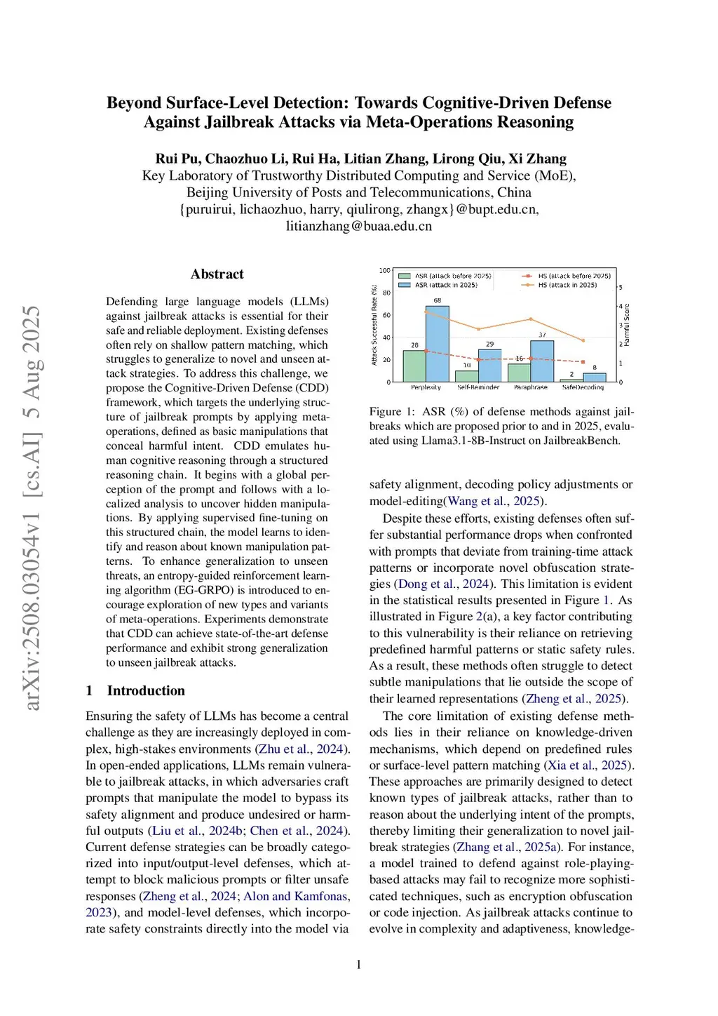 Defending large language models (LLMs) against jailbreak attacks is essential for their safe and reliable deployment. Existing defenses often rely on shallow pattern matching, which struggles to generalize to novel and unseen attack strategies. To address this challenge, we propose the Cognitive-Driven Defense (CDD) framework, which targets the underlying structure of jailbreak prompts by applying meta-operations, defined as basic manipulations that conceal harmfulthis http URLemulates human cognitive reasoning through a structured reasoning chain. It begins with a global perception of the prompt and follows with a localized analysis to uncover hidden manipulations. By applying supervised fine-tuning on this structured chain, the model learns to identify and reason about known manipulation patterns. To enhance generalization to unseen threats, an entropy-guided reinforcement learning algorithm (EG-GRPO) is introduced to encourage exploration of new types and variants of meta-operations. Experiments demonstrate that CDD can achieve state-of-the-art defense performance and exhibit strong generalization to unseen jailbreak attacks.