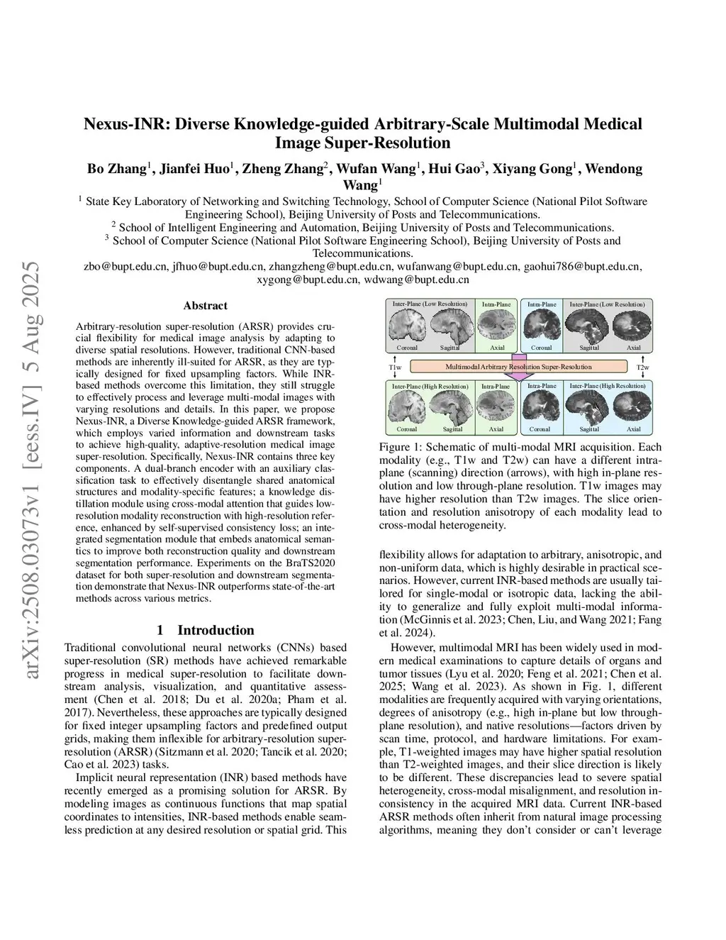 Arbitrary-resolution super-resolution (ARSR) provides crucial flexibility for medical image analysis by adapting to diverse spatial resolutions. However, traditional CNN-based methods are inherently ill-suited for ARSR, as they are typically designed for fixed upsampling factors. While INR-based methods overcome this limitation, they still struggle to effectively process and leverage multi-modal images with varying resolutions and details. In this paper, we propose Nexus-INR, a Diverse Knowledge-guided ARSR framework, which employs varied information and downstream tasks to achieve high-quality, adaptive-resolution medical image super-resolution. Specifically, Nexus-INR contains three key components. A dual-branch encoder with an auxiliary classification task to effectively disentangle shared anatomical structures and modality-specific features; a knowledge distillation module using cross-modal attention that guides low-resolution modality reconstruction with high-resolution reference, enhanced by self-supervised consistency loss; an integrated segmentation module that embeds anatomical semantics to improve both reconstruction quality and downstream segmentation performance. Experiments on the BraTS2020 dataset for both super-resolution and downstream segmentation demonstrate that Nexus-INR outperforms state-of-the-art methods across various metrics.