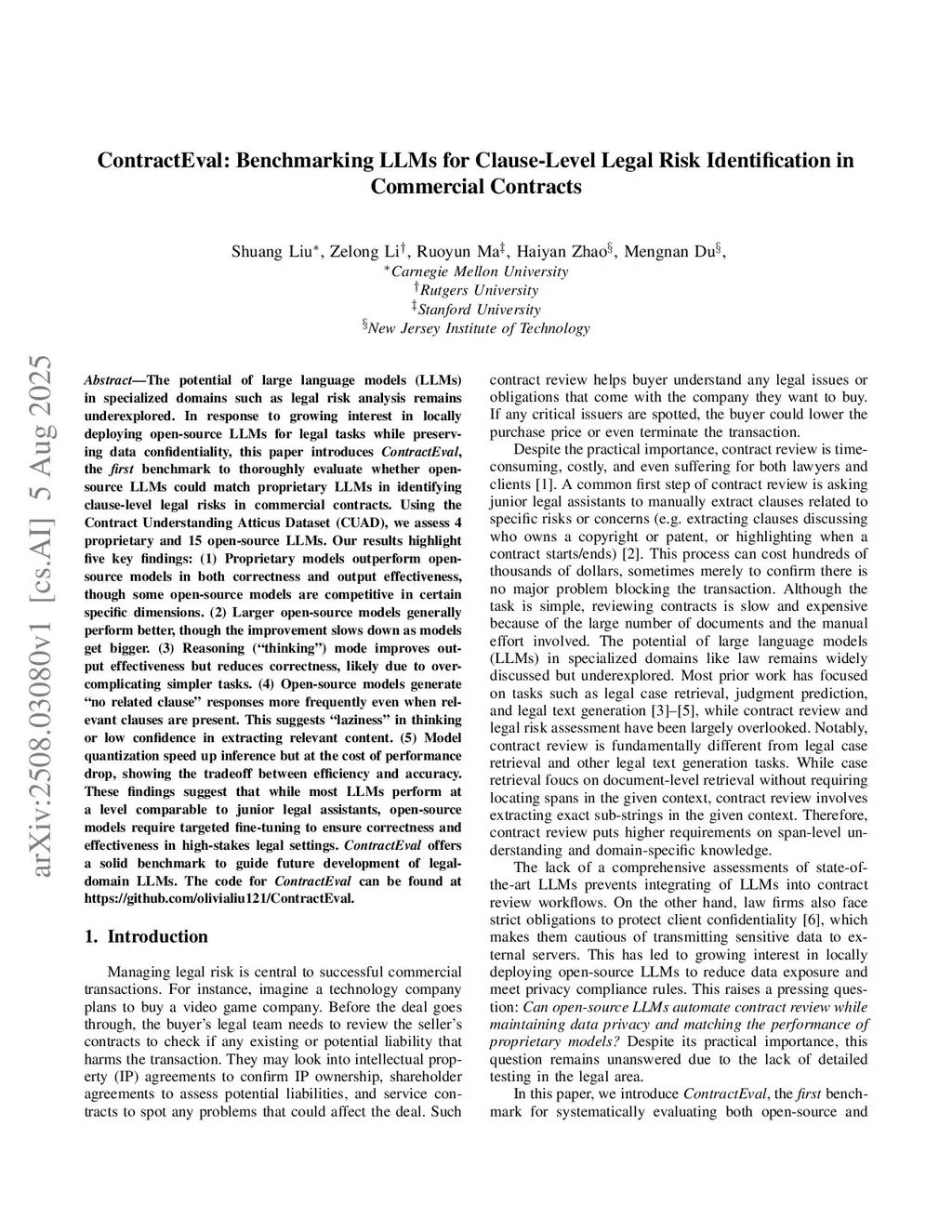The potential of large language models (LLMs) in specialized domains such as legal risk analysis remains underexplored. In response to growing interest in locally deploying open-source LLMs for legal tasks while preserving data confidentiality, this paper introduces ContractEval, the first benchmark to thoroughly evaluate whether open-source LLMs could match proprietary LLMs in identifying clause-level legal risks in commercial contracts. Using the Contract Understanding Atticus Dataset (CUAD), we assess 4 proprietary and 15 open-source LLMs. Our results highlight five key findings: (1) Proprietary models outperform open-source models in both correctness and output effectiveness, though some open-source models are competitive in certain specific dimensions. (2) Larger open-source models generally perform better, though the improvement slows down as models get bigger. (3) Reasoning ("thinking") mode improves output effectiveness but reduces correctness, likely due to over-complicating simpler tasks. (4) Open-source models generate "no related clause" responses more frequently even when relevant clauses are present. This suggests "laziness" in thinking or low confidence in extracting relevant content. (5) Model quantization speeds up inference but at the cost of performance drop, showing the tradeoff between efficiency and accuracy. These findings suggest that while most LLMs perform at a level comparable to junior legal assistants, open-source models require targeted fine-tuning to ensure correctness and effectiveness in high-stakes legal settings. ContractEval offers a solid benchmark to guide future development of legal-domain LLMs.