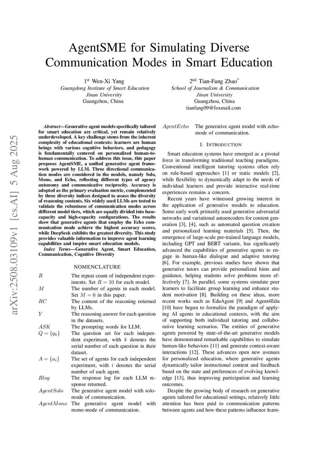Generative agent models specifically tailored for smart education are critical, yet remain relatively underdeveloped. A key challenge stems from the inherent complexity of educational contexts: learners are human beings with various cognitive behaviors, and pedagogy is fundamentally centered on personalized human-to-human communication. To address this issue, this paper proposes AgentSME, a unified generative agent framework powered by LLM. Three directional communication modes are considered in the models, namely Solo, Mono, and Echo, reflecting different types of agency autonomy and communicative reciprocity. Accuracy is adopted as the primary evaluation metric, complemented by three diversity indices designed to assess the diversity of reasoning contents. Six widely used LLMs are tested to validate the robustness of communication modes across different model tiers, which are equally divided into base-capacity and high-capacity configurations. The results show that generative agents that employ the Echo communication mode achieve the highest accuracy scores, while DeepSeek exhibits the greatest diversity. This study provides valuable information to improve agent learning capabilities and inspire smart education models.