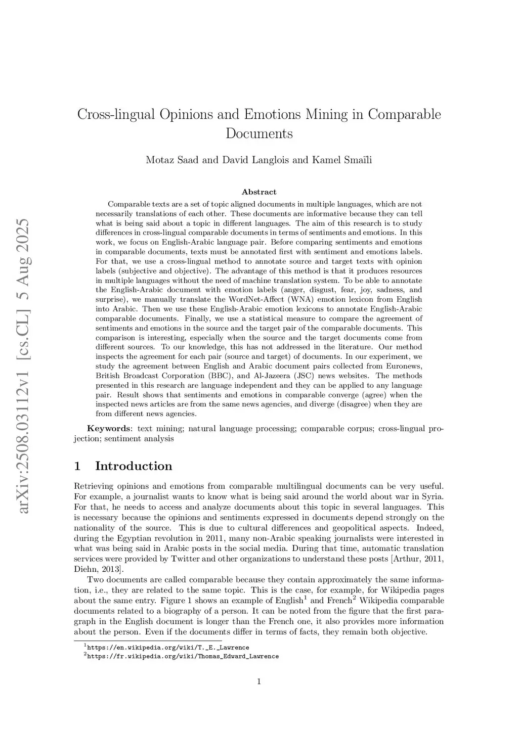 Cross-lingual Opinions and Emotions Mining in Comparable Documents