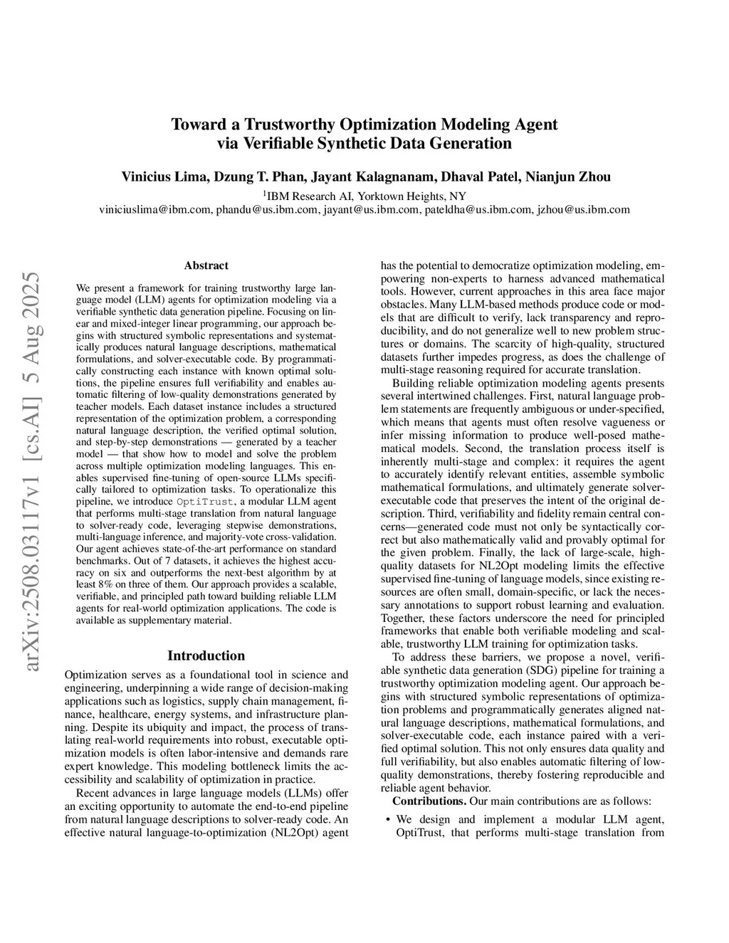 We present a framework for training trustworthy large language model (LLM) agents for optimization modeling via a verifiable synthetic data generation pipeline. Focusing on linear and mixed-integer linear programming, our approach begins with structured symbolic representations and systematically produces natural language descriptions, mathematical formulations, and solver-executable code. By programmatically constructing each instance with known optimal solutions, the pipeline ensures full verifiability and enables automatic filtering of low-quality demonstrations generated by teacher models. Each dataset instance includes a structured representation of the optimization problem, a corresponding natural language description, the verified optimal solution, and step-by-step demonstrations - generated by a teacher model - that show how to model and solve the problem across multiple optimization modeling languages. This enables supervised fine-tuning of open-source LLMs specifically tailored to optimization tasks. To operationalize this pipeline, we introduce OptiTrust, a modular LLM agent that performs multi-stage translation from natural language to solver-ready code, leveraging stepwise demonstrations, multi-language inference, and majority-vote cross-validation. Our agent achieves state-of-the-art performance on standard benchmarks. Out of 7 datasets, it achieves the highest accuracy on six and outperforms the next-best algorithm by at least 8 percentage on three of them. Our approach provides a scalable, verifiable, and principled path toward building reliable LLM agents for real-world optimization applications.