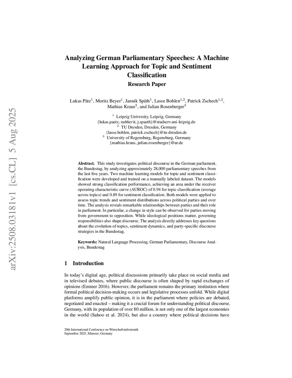 Analyzing German Parliamentary Speeches: A Machine Learning Approach for Topic and Sentiment Classification