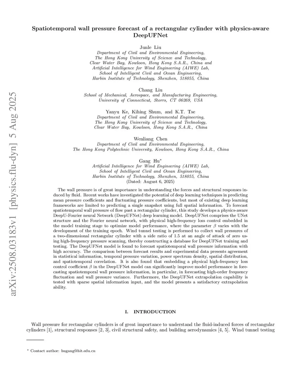 The wall pressure is of great importance in understanding the forces and structural responses induced by fluid. Recent works have investigated the potential of deep learning techniques in predicting mean pressure coefficients and fluctuating pressure coefficients, but most of existing deep learning frameworks are limited to predicting a single snapshot using full spatial information. To forecast spatiotemporal wall pressure of flow past a rectangular cylinder, this study develops a physics-aware DeepU-Fourier neural Network (DeepUFNet) deep learning model. DeepUFNet comprises the UNet structure and the Fourier neural network, with physical high-frequency loss control embedded in the model training stage to optimize model performance. Wind tunnel testing was performed to collect wall pressures on two-dimensional rectangular cylinders using high-frequency pressure scanning, thereby constructing a database for DeepUFNet training and testing. The DeepUFNet model is found capable of forecasting spatiotemporal wall pressure information with high accuracy on the rectangular cylinder with side ratio 1.5. The comparison between forecast results and experimental data presents agreement in statistical information and physical interpretation. It is also found that embedding a physical high-frequency loss control coefficient b in the DeepUFNet model can significantly improve model performance in forecasting spatiotemporal wall pressure information, particularly, high-order frequency fluctuation and wall pressure variance. Furthermore, the DeepUFNet extrapolation capability is tested with sparse spatial information input, and the model presents a satisfactory extrapolation ability. Last, the DeepUFNet is tested for generalization in unseen cases, rectangular cylinders with side ratio 4 and 3.75, and the model presents satisfactory generalization ability.