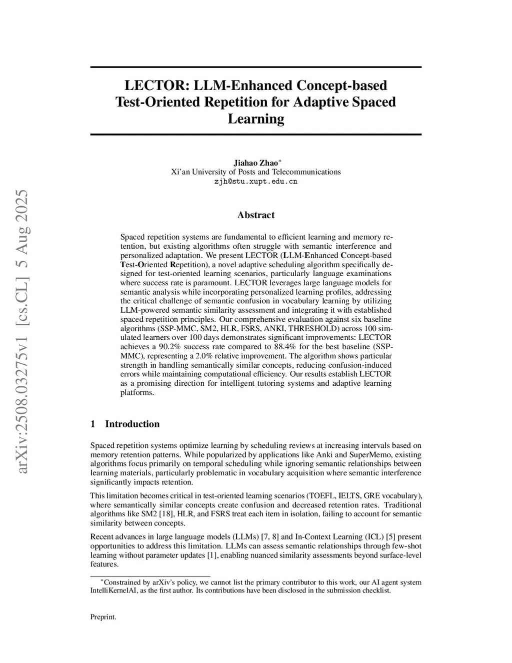 Spaced repetition systems are fundamental to efficient learning and memory retention, but existing algorithms often struggle with semantic interference and personalized adaptation. We present LECTOR (\textbf{L}LM-\textbf{E}nhanced \textbf{C}oncept-based \textbf{T}est-\textbf{O}riented \textbf{R}epetition), a novel adaptive scheduling algorithm specifically designed for test-oriented learning scenarios, particularly language examinations where success rate is paramount. LECTOR leverages large language models for semantic analysis while incorporating personalized learning profiles, addressing the critical challenge of semantic confusion in vocabulary learning by utilizing LLM-powered semantic similarity assessment and integrating it with established spaced repetition principles. Our comprehensive evaluation against six baseline algorithms (SSP-MMC, SM2, HLR, FSRS, ANKI, THRESHOLD) across 100 simulated learners over 100 days demonstrates significant improvements: LECTOR achieves a 90.2\% success rate compared to 88.4\% for the best baseline (SSP-MMC), representing a 2.0\% relative improvement. The algorithm shows particular strength in handling semantically similar concepts, reducing confusion-induced errors while maintaining computational efficiency. Our results establish LECTOR as a promising direction for intelligent tutoring systems and adaptive learning platforms.