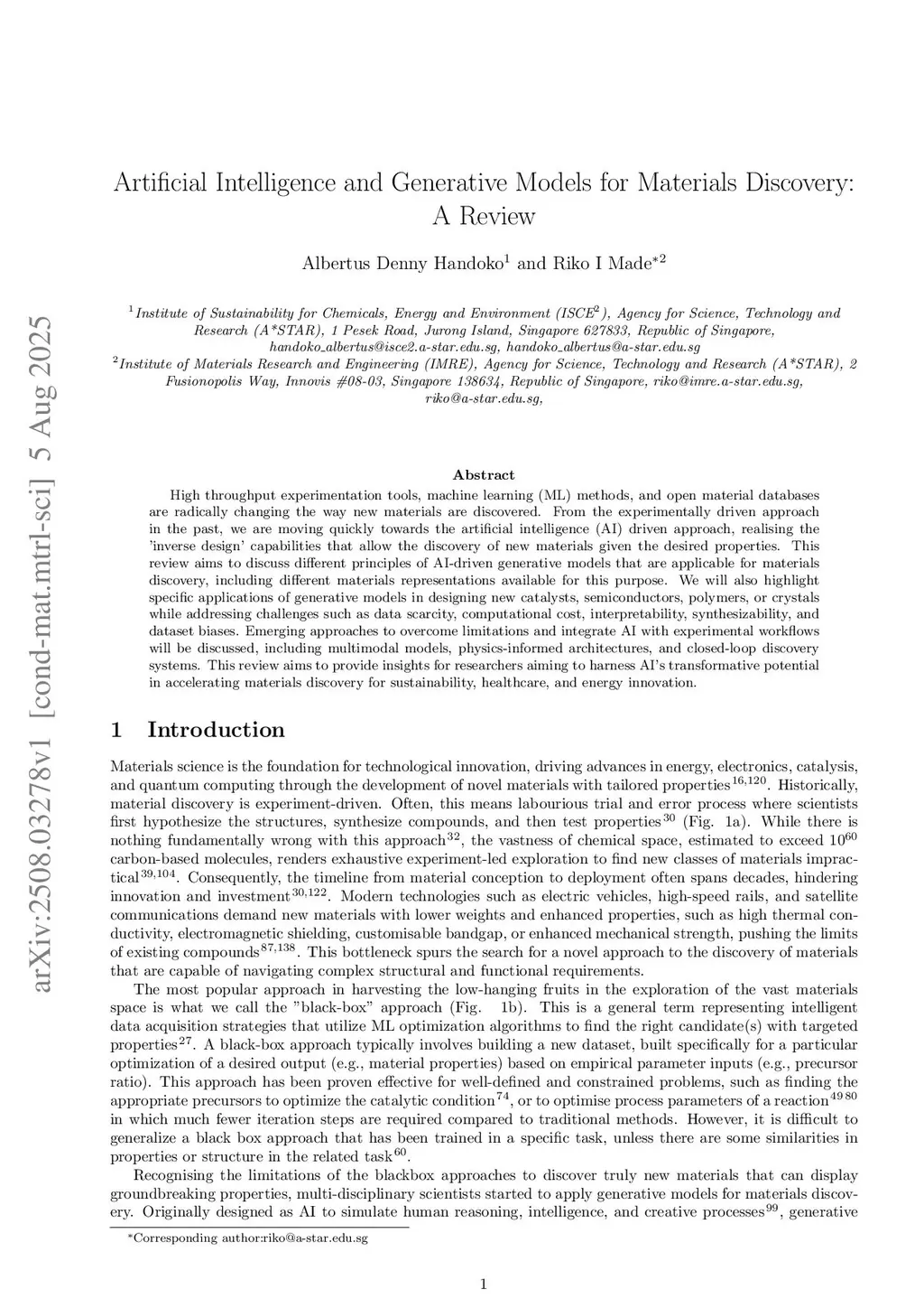 Artificial Intelligence and Generative Models for Materials Discovery -- A Review