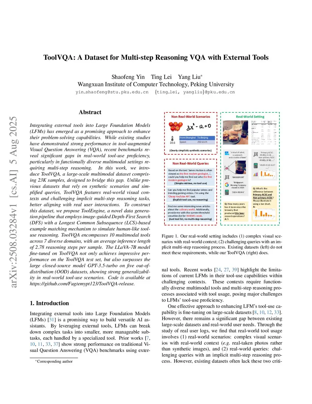 Integrating external tools into Large Foundation Models (LFMs) has emerged as a promising approach to enhance their problem-solving capabilities. While existing studies have demonstrated strong performance in tool-augmented Visual Question Answering (VQA), recent benchmarks reveal significant gaps in real-world tool-use proficiency, particularly in functionally diverse multimodal settings requiring multi-step reasoning. In this work, we introduce ToolVQA, a large-scale multimodal dataset comprising 23K instances, designed to bridge this gap. Unlike previous datasets that rely on synthetic scenarios and simplified queries, ToolVQA features real-world visual contexts and challenging implicit multi-step reasoning tasks, better aligning with real user interactions. To construct this dataset, we propose ToolEngine, a novel data generation pipeline that employs Depth-First Search (DFS) with a dynamic in-context example matching mechanism to simulate human-like tool-use reasoning. ToolVQA encompasses 10 multimodal tools across 7 diverse task domains, with an average inference length of 2.78 reasoning steps per instance. The fine-tuned 7B LFMs on ToolVQA not only achieve impressive performance on our test set but also surpass the large close-sourced model GPT-3.5-turbo on various out-of-distribution (OOD) datasets, demonstrating strong generalizability to real-world tool-use scenarios.
