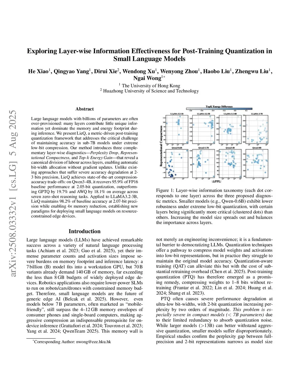 Large language models with billions of parameters are often over-provisioned: many layers contribute little unique information yet dominate the memory and energy footprint during inference. We present LieQ, a metric-driven post-training quantization framework that addresses the critical challenge of maintaining accuracy in sub-7B models under extreme low-bit compression. Our method introduces three complementary layer-wise diagnostics-Perplexity Drop, Representational Compactness, and Top-k Energy Gain -that reveal a canonical division of labour across layers, enabling automatic bit-width allocation without gradient updates. Unlike existing approaches that suffer severe accuracy degradation at 2-3 bits precision, LieQ achieves state-of-the-art compression-accuracy trade-offs: on Qwen3-4B, it recovers 95.9% of FP16 baseline performance at 2.05-bit quantization, outperforming GPTQ by 19.7% and AWQ by 18.1% on average across seven zero-shot reasoning tasks. Applied to LLaMA3.2-3B, LieQ maintains 98.2% of baseline accuracy at 2.07-bit precision while enabling 4x memory reduction, establishing new paradigms for deploying small language models on resource-constrained edge devices.
