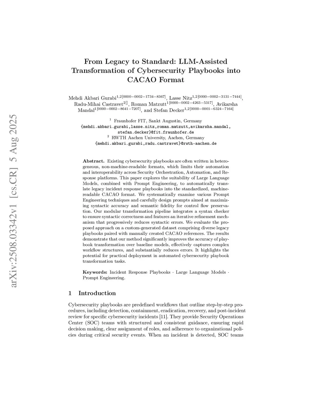Existing cybersecurity playbooks are often written in heterogeneous, non-machine-readable formats, which limits their automation and interoperability across Security Orchestration, Automation, and Response platforms. This paper explores the suitability of Large Language Models, combined with Prompt Engineering, to automatically translate legacy incident response playbooks into the standardized, machine-readable CACAO format. We systematically examine various Prompt Engineering techniques and carefully design prompts aimed at maximizing syntactic accuracy and semantic fidelity for control flow preservation. Our modular transformation pipeline integrates a syntax checker to ensure syntactic correctness and features an iterative refinement mechanism that progressively reduces syntactic errors. We evaluate the proposed approach on a custom-generated dataset comprising diverse legacy playbooks paired with manually created CACAO references. The results demonstrate that our method significantly improves the accuracy of playbook transformation over baseline models, effectively captures complex workflow structures, and substantially reduces errors. It highlights the potential for practical deployment in automated cybersecurity playbook transformation tasks.