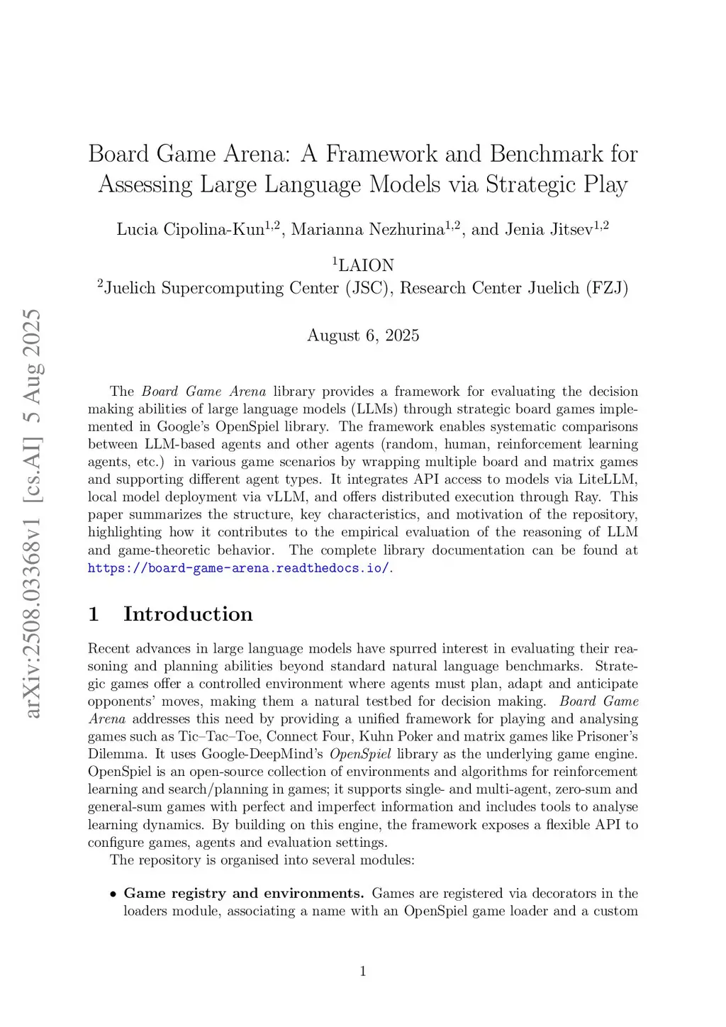 The Game Reasoning Arena library provides a framework for evaluating the decision making abilities of large language models (LLMs) through strategic board games implemented in Google OpenSpiel library. The framework enables systematic comparisons between LLM based agents and other agents (random, heuristic, reinforcement learning agents, etc.) in various game scenarios by wrapping multiple board and matrix games and supporting different agent types. It integrates API access to models via liteLLM, local model deployment via vLLM, and offers distributed execution through Ray. This paper summarises the library structure, key characteristics, and motivation of the repository, highlighting how it contributes to the empirical evaluation of the reasoning of LLM and game theoretic behaviour.