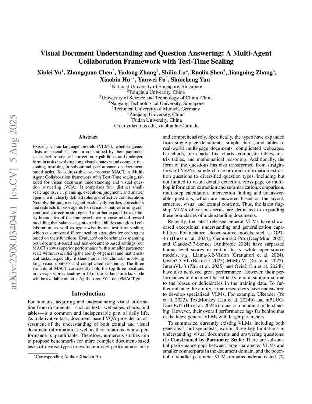 The dominant paradigm of monolithic scaling in Vision-Language Models (VLMs) is failing for understanding and reasoning in documents, yielding diminishing returns as it struggles with the inherent need of this domain for document-based procedural reasoning, cognitive complexity, and factual accuracy. To this end, we introduce MACT, a Multi-Agent Collaboration framework with agent-wise adaptive Test-time scaling that pioneers a paradigm shift to procedural scaling, adapting dynamically to the functional entities of visual documents understanding and reasoning. MACT decomposes the visual document processing flow into four specialized agents, i.e., planning, execution, judgment, and answer, to resolve cognitive overload and introduce a critical self-correction loop for factual grounding. This collaborative architecture is amplified by an agent-wise adaptive test-time scaling strategy that intelligently allocates computational resources based on the complexity and redundancy of each functionality. Evaluated on multiple visual document understanding benchmarks, MACT achieves superior performance with a smaller parameter scale, adapting effectively to various document scenarios without compromising its general or mathematical reasoning capabilities. The three variants of MACT consistently attain top-three average performance rankings, with average performance enhancements of 9.9-11.5% over the base models. The source code will be released publicly.