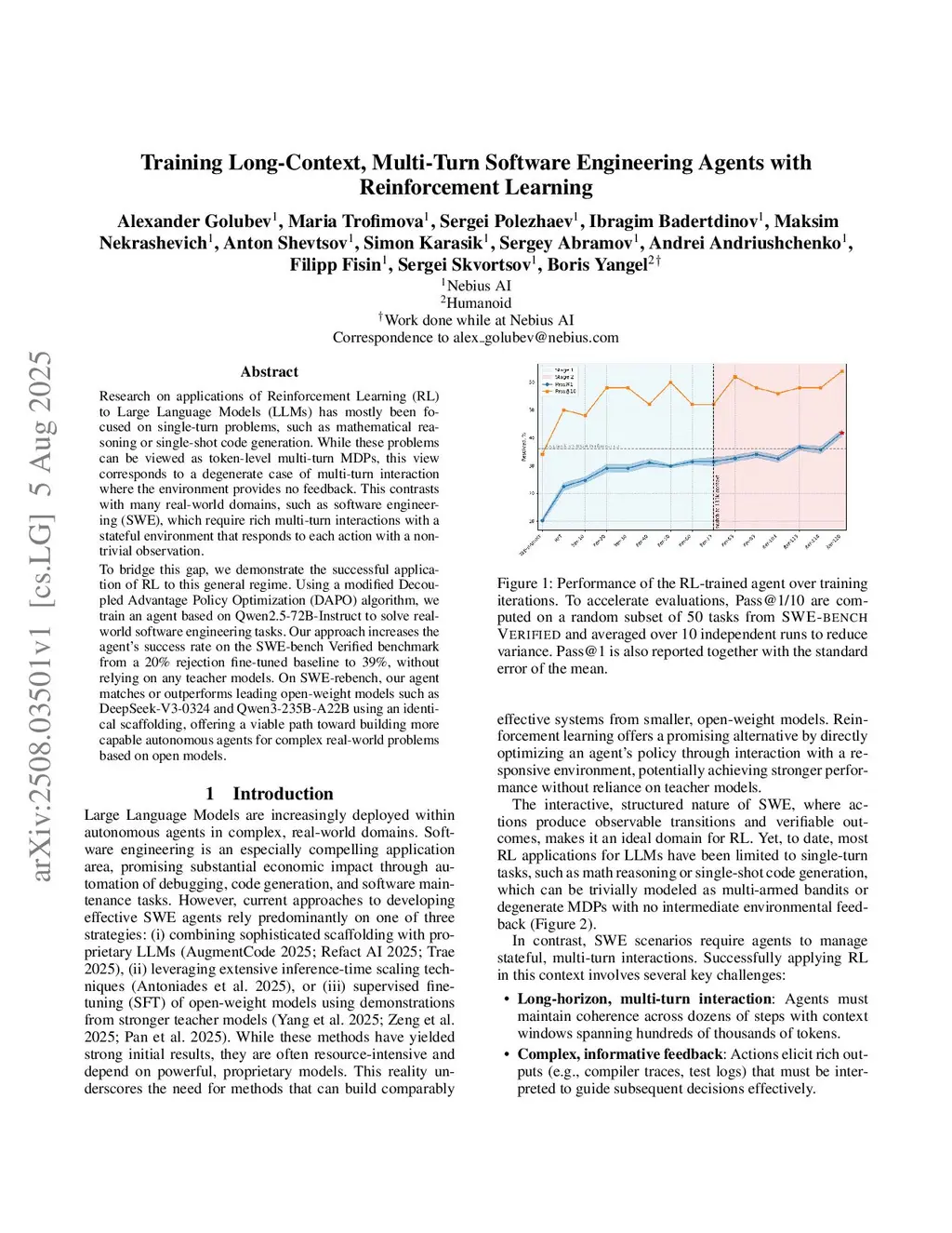 Research on applications of reinforcement learning (RL) to large language models has mostly been focused on single-turn problems, such as mathematical reasoning or single-shot code generation. While these problems can be viewed as token-level multi-turn Markov decision processes (MDPs), this view corresponds to a degenerate case of multi-turn interaction where the environment provides no feedback. This contrasts with many real-world domains, such as software engineering (SWE), which require rich multi-turn interactions with a stateful environment that responds to each action with a non-trivial observation. To bridge this gap, we demonstrate the successful application of RL to this general regime. Our methodology begins with rejection fine-tuning (RFT) using execution feedback to train a policy to follow instructions and formatting effectively, followed by a synchronous RL pipeline using DAPO for iterative improvement. Applying this pipeline to Qwen2.5-72B-Instruct, we increase its Pass@1 on the SWE-bench Verified benchmark from 11% to 39%, substantially improving upon the 20% RFT baseline. On the May and June splits of SWE-rebench, the resulting agent achieves Pass@1 of 35% and 31% respectively, competitive with even larger models such as DeepSeek-V3-0324 or Qwen3-235B-A22B, demonstrating that our methodology offers a practical approach for training capable agents for multi-turn interactive tasks using open-weight models.