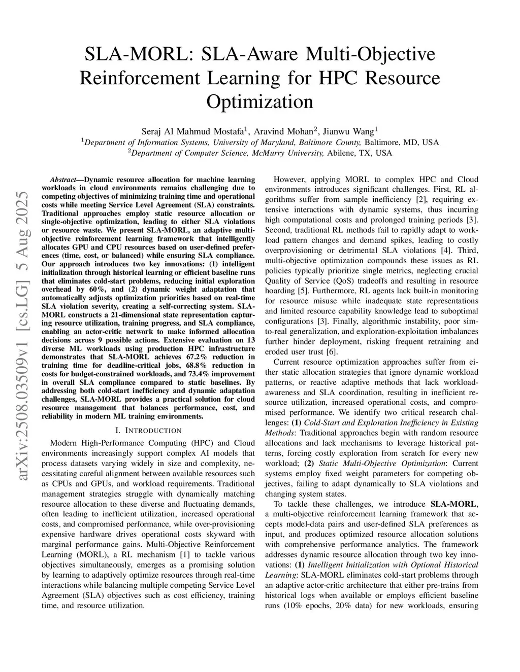 Dynamic resource allocation for machine learning workloads in cloud environments remains challenging due to competing objectives of minimizing training time and operational costs while meeting Service Level Agreement (SLA) constraints. Traditional approaches employ static resource allocation or single-objective optimization, leading to either SLA violations or resource waste. We present SLA-MORL, an adaptive multi-objective reinforcement learning framework that intelligently allocates GPU and CPU resources based on user-defined preferences (time, cost, or balanced) while ensuring SLA compliance. Our approach introduces two key innovations: (1) intelligent initialization through historical learning or efficient baseline runs that eliminates cold-start problems, reducing initial exploration overhead by 60%, and (2) dynamic weight adaptation that automatically adjusts optimization priorities based on real-time SLA violation severity, creating a self-correcting system. SLA-MORL constructs a 21-dimensional state representation capturing resource utilization, training progress, and SLA compliance, enabling an actor-critic network to make informed allocation decisions across 9 possible actions. Extensive evaluation on 13 diverse ML workloads using production HPC infrastructure demonstrates that SLA-MORL achieves 67.2% reduction in training time for deadline-critical jobs, 68.8% reduction in costs for budget-constrained workloads, and 73.4% improvement in overall SLA compliance compared to static baselines. By addressing both cold-start inefficiency and dynamic adaptation challenges, SLA-MORL provides a practical solution for cloud resource management that balances performance, cost, and reliability in modern ML training environments.