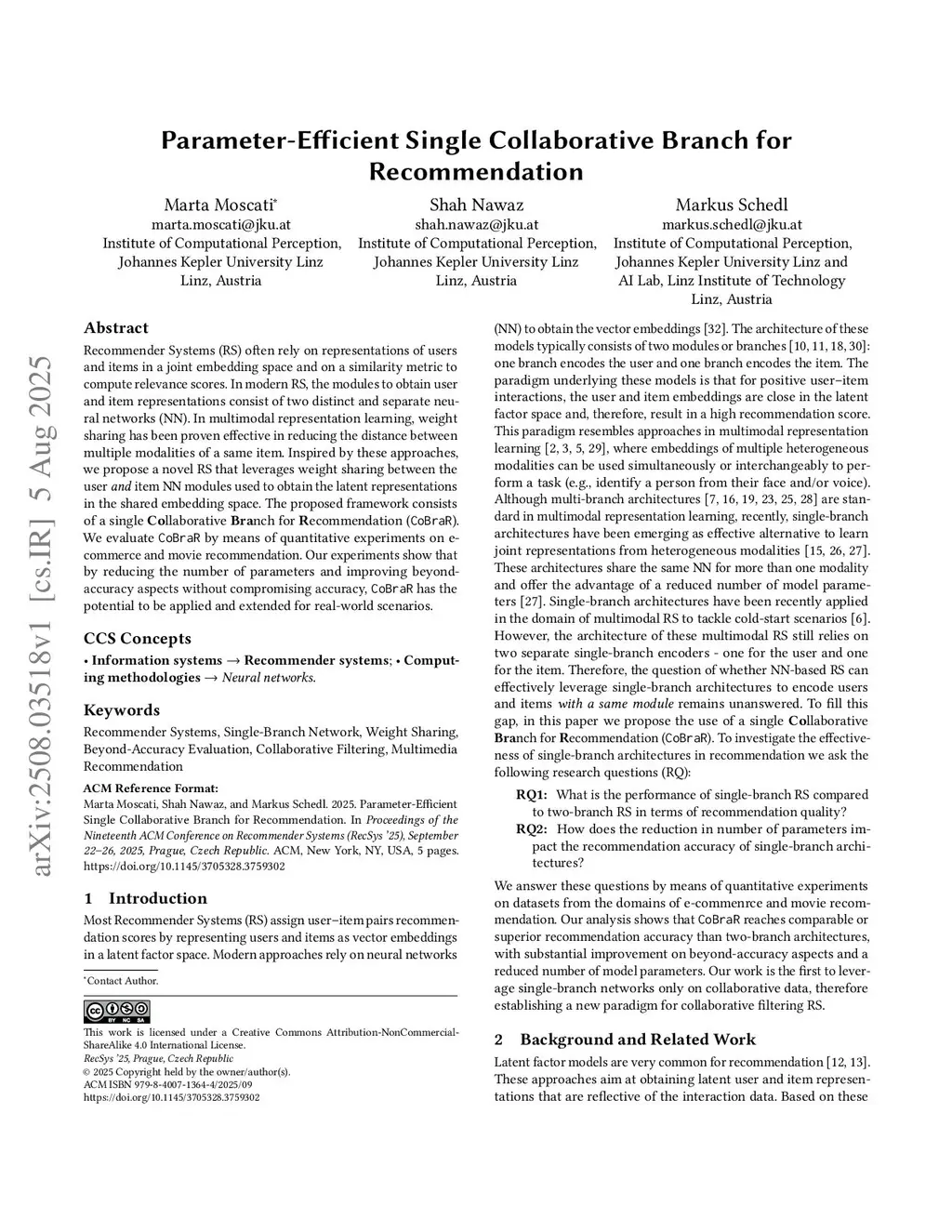 Recommender Systems (RS) often rely on representations of users and items in a joint embedding space and on a similarity metric to compute relevance scores. In modern RS, the modules to obtain user and item representations consist of two distinct and separate neural networks (NN). In multimodal representation learning, weight sharing has been proven effective in reducing the distance between multiple modalities of a same item. Inspired by these approaches, we propose a novel RS that leverages weight sharing between the user and item NN modules used to obtain the latent representations in the shared embedding space. The proposed framework consists of a single Collaborative Branch for Recommendation (CoBraR). We evaluate CoBraR by means of quantitative experiments on e-commerce and movie recommendation. Our experiments show that by reducing the number of parameters and improving beyond-accuracy aspects without compromising accuracy, CoBraR has the potential to be applied and extended for real-world scenarios.