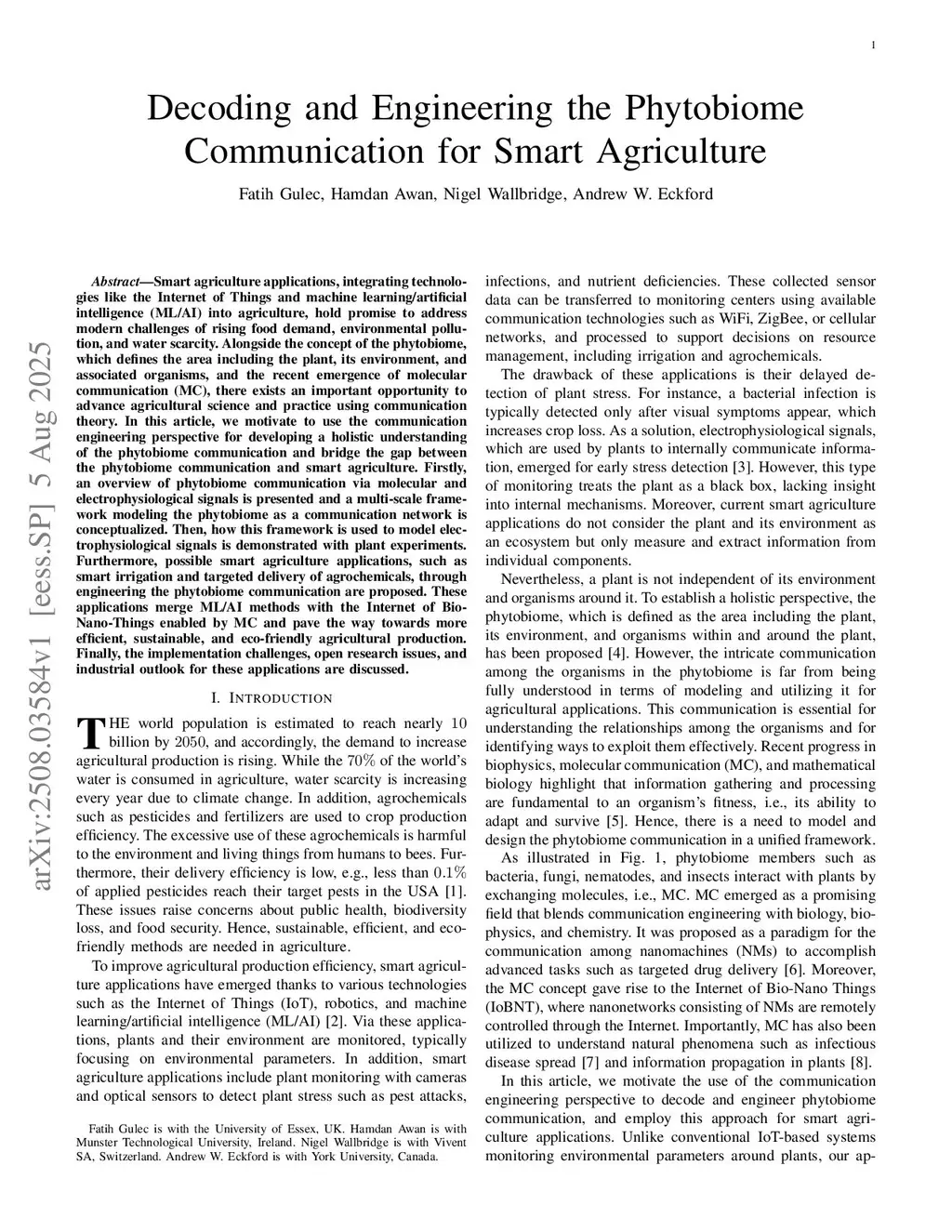 Smart agriculture applications, integrating technologies like the Internet of Things and machine learning/artificial intelligence (ML/AI) into agriculture, hold promise to address modern challenges of rising food demand, environmental pollution, and water scarcity. Alongside the concept of the phytobiome, which defines the area including the plant, its environment, and associated organisms, and the recent emergence of molecular communication (MC), there exists an important opportunity to advance agricultural science and practice using communication theory. In this article, we motivate to use the communication engineering perspective for developing a holistic understanding of the phytobiome communication and bridge the gap between the phytobiome communication and smart agriculture. Firstly, an overview of phytobiome communication via molecular and electrophysiological signals is presented and a multi-scale framework modeling the phytobiome as a communication network is conceptualized. Then, how this framework is used to model electrophysiological signals is demonstrated with plant experiments. Furthermore, possible smart agriculture applications, such as smart irrigation and targeted delivery of agrochemicals, through engineering the phytobiome communication are proposed. These applications merge ML/AI methods with the Internet of Bio-Nano-Things enabled by MC and pave the way towards more efficient, sustainable, and eco-friendly agricultural production. Finally, the implementation challenges, open research issues, and industrial outlook for these applications are discussed.
