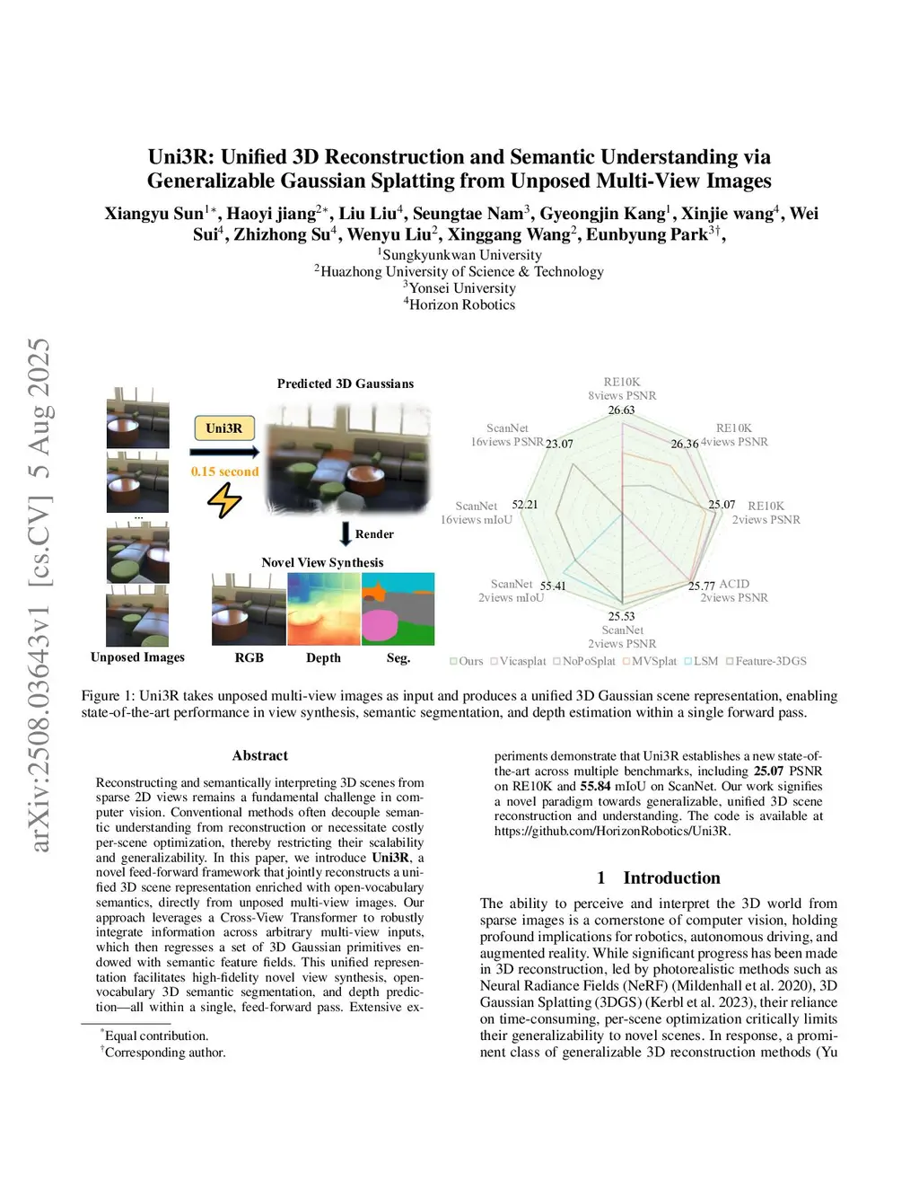 Reconstructing and semantically interpreting 3D scenes from sparse 2D views remains a fundamental challenge in computer vision. Conventional methods often decouple semantic understanding from reconstruction or necessitate costly per-scene optimization, thereby restricting their scalability and generalizability. In this paper, we introduce Uni3R, a novel feed-forward framework that jointly reconstructs a unified 3D scene representation enriched with open-vocabulary semantics, directly from unposed multi-view images. Our approach leverages a Cross-View Transformer to robustly integrate information across arbitrary multi-view inputs, which then regresses a set of 3D Gaussian primitives endowed with semantic feature fields. This unified representation facilitates high-fidelity novel view synthesis, open-vocabulary 3D semantic segmentation, and depth prediction, all within a single, feed-forward pass. Extensive experiments demonstrate that Uni3R establishes a new state-of-the-art across multiple benchmarks, including 25.07 PSNR on RE10K and 55.84 mIoU on ScanNet. Our work signifies a novel paradigm towards generalizable, unified 3D scene reconstruction and understanding. The code is available atthis https URL.