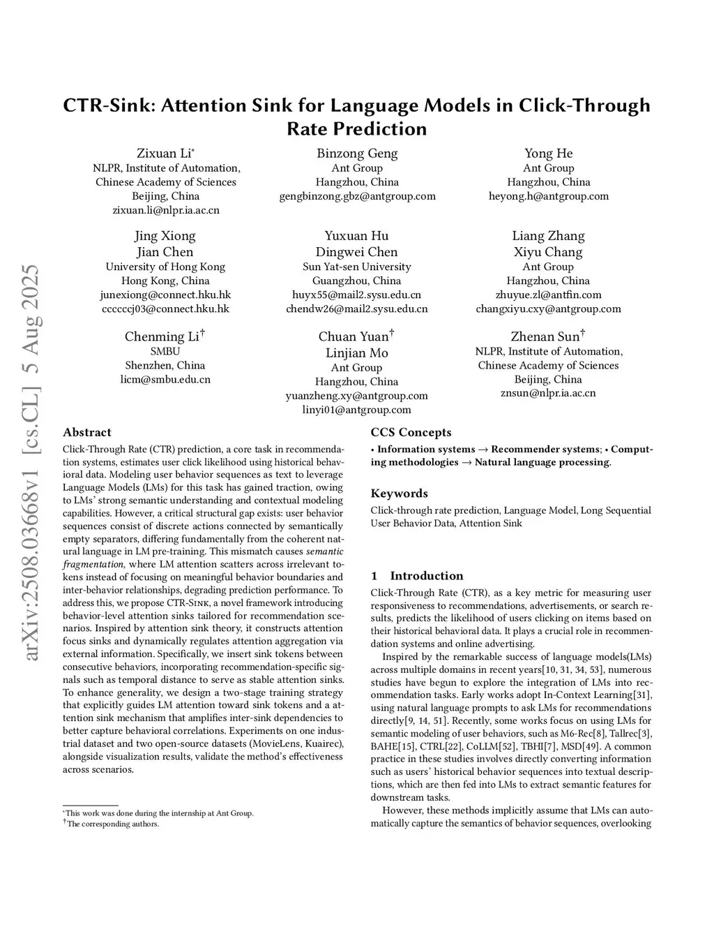 CTR-Sink: Attention Sink for Language Models in Click-Through Rate Prediction