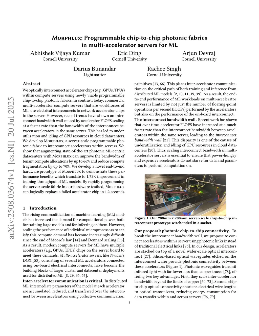 We optically interconnect accelerator chips (e.g., GPUs, TPUs) within compute servers using newly viable programmable chip-to-chip photonic fabrics. In contrast, today, commercial multi-accelerator compute servers that are workhorses of ML, use electrical interconnects to network accelerator chips in the server. However, recent trends have shown an interconnect bandwidth wall caused by accelerator FLOPS scaling at a faster rate than the bandwidth of the interconnect between accelerators in the same server. This has led to under-utilization and idling of GPU resources in cloud datacenters. We develop Morphlux, a server-scale programmable photonic fabric, to interconnect accelerators within servers. We show that augmenting state-of-the-art photonic ML-centric datacenters with Morphlux can improve the bandwidth of tenant compute allocations by up to 66% and reduce compute fragmentation by up to 70%. We develop a novel end-to-end hardware prototype of Morphlux to demonstrate these performance benefits, which translate to 1.72x improvement in training throughput of ML models. By rapidly programming the server-scale fabric in our hardware testbed, Morphlux can logically replace a failed accelerator chip in 1.2 seconds.