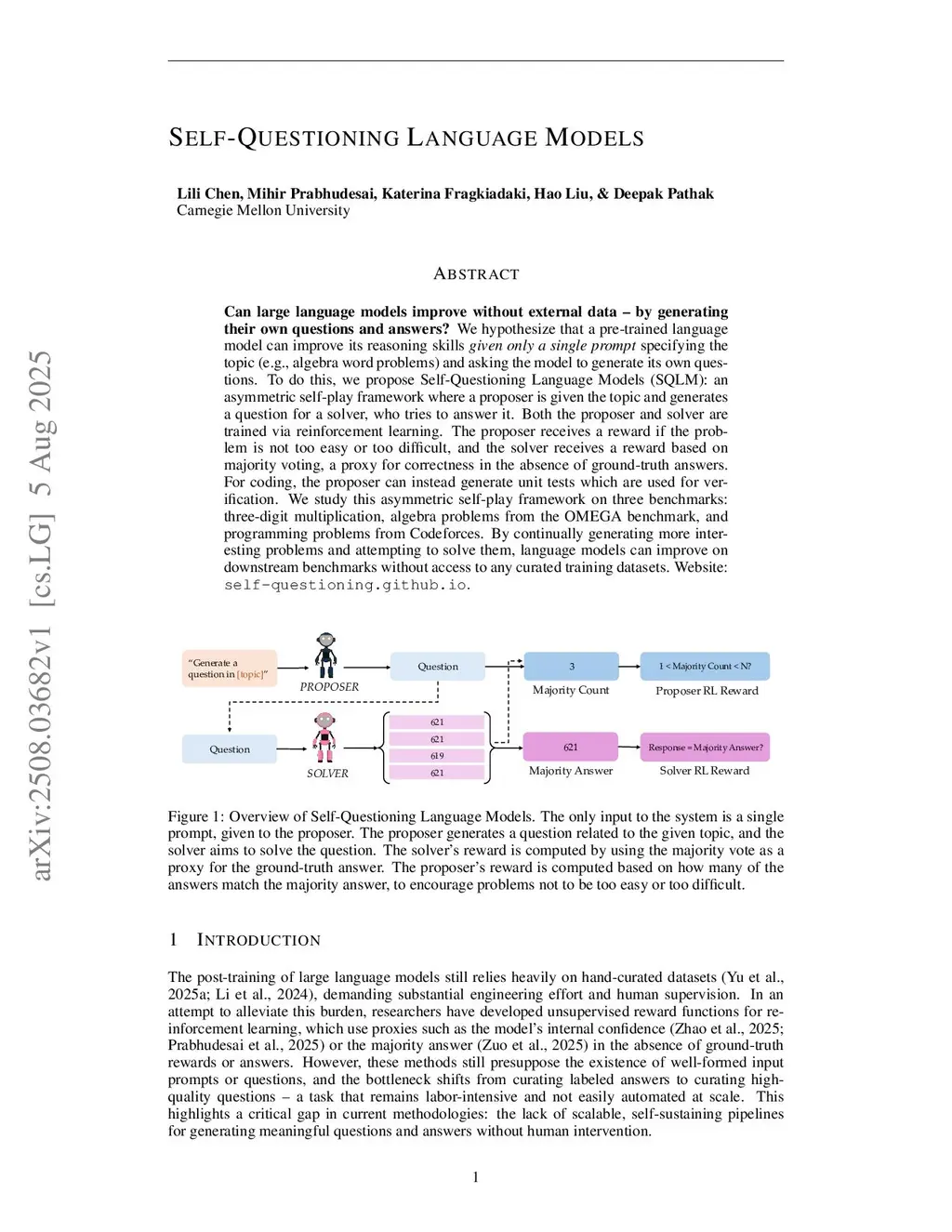 Can large language models improve without external data -- by generating their own questions and answers? We hypothesize that a pre-trained language model can improve its reasoning skills given only a single prompt specifying the topic (e.g., algebra word problems) and asking the model to generate its own questions. To do this, we propose Self-Questioning Language Models (SQLM): an asymmetric self-play framework where a proposer is given the topic and generates a question for a solver, who tries to answer it. Both the proposer and solver are trained via reinforcement learning. The proposer receives a reward if the problem is not too easy or too difficult, and the solver receives a reward based on majority voting, a proxy for correctness in the absence of ground-truth answers. For coding, the proposer can instead generate unit tests which are used for verification. We study this asymmetric self-play framework on three benchmarks: three-digit multiplication, algebra problems from the OMEGA benchmark, and programming problems from Codeforces. By continually generating more interesting problems and attempting to solve them, language models can improve on downstream benchmarks without access to any curated training datasets.