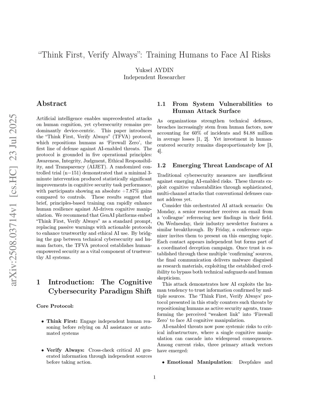 Artificial intelligence enables unprecedented attacks on human cognition, yet cybersecurity remains predominantly device-centric. This paper introduces the "Think First, Verify Always" (TFVA) protocol, which repositions humans as 'Firewall Zero', the first line of defense against AI-enabled threats. The protocol is grounded in five operational principles: Awareness, Integrity, Judgment, Ethical Responsibility, and Transparency (AIJET). A randomized controlled trial (n=151) demonstrated that a minimal 3-minute intervention produced statistically significant improvements in cognitive security task performance, with participants showing an absolute +7.87% gains compared to controls. These results suggest that brief, principles-based training can rapidly enhance human resilience against AI-driven cognitive manipulation. We recommend that GenAI platforms embed "Think First, Verify Always" as a standard prompt, replacing passive warnings with actionable protocols to enhance trustworthy and ethical AI use. By bridging the gap between technical cybersecurity and human factors, the TFVA protocol establishes human-empowered security as a vital component of trustworthy AI systems.