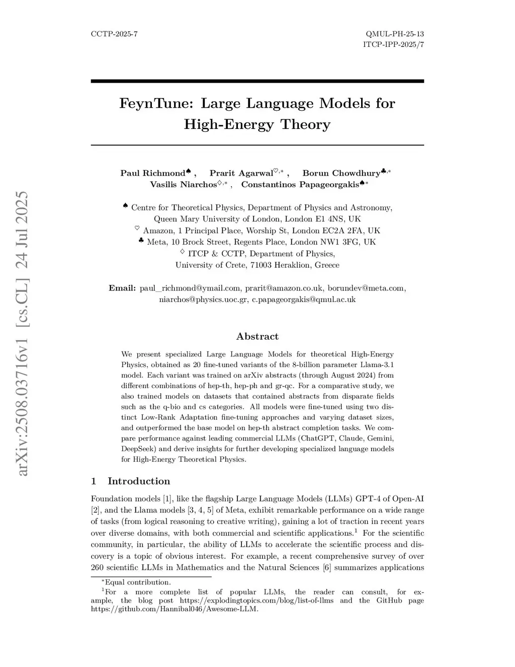 We present specialized Large Language Models for theoretical High-Energy Physics, obtained as 20 fine-tuned variants of the 8-billion parameter Llama-3.1 model. Each variant was trained on arXiv abstracts (through August 2024) from different combinations of hep-th, hep-ph and gr-qc. For a comparative study, we also trained models on datasets that contained abstracts from disparate fields such as the q-bio and cs categories. All models were fine-tuned using two distinct Low-Rank Adaptation fine-tuning approaches and varying dataset sizes, and outperformed the base model on hep-th abstract completion tasks. We compare performance against leading commercial LLMs (ChatGPT, Claude, Gemini, DeepSeek) and derive insights for further developing specialized language models for High-Energy Theoretical Physics.