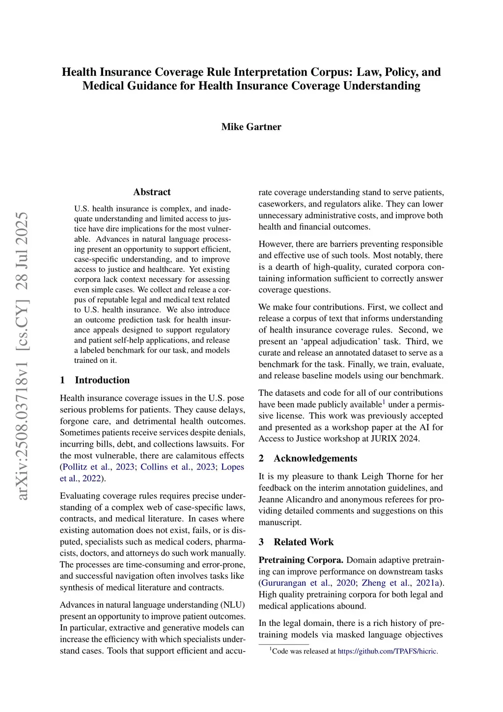 U.S. health insurance is complex, and inadequate understanding and limited access to justice have dire implications for the most vulnerable. Advances in natural language processing present an opportunity to support efficient, case-specific understanding, and to improve access to justice and healthcare. Yet existing corpora lack context necessary for assessing even simple cases. We collect and release a corpus of reputable legal and medical text related to U.S. health insurance. We also introduce an outcome prediction task for health insurance appeals designed to support regulatory and patient self-help applications, and release a labeled benchmark for our task, and models trained on it.