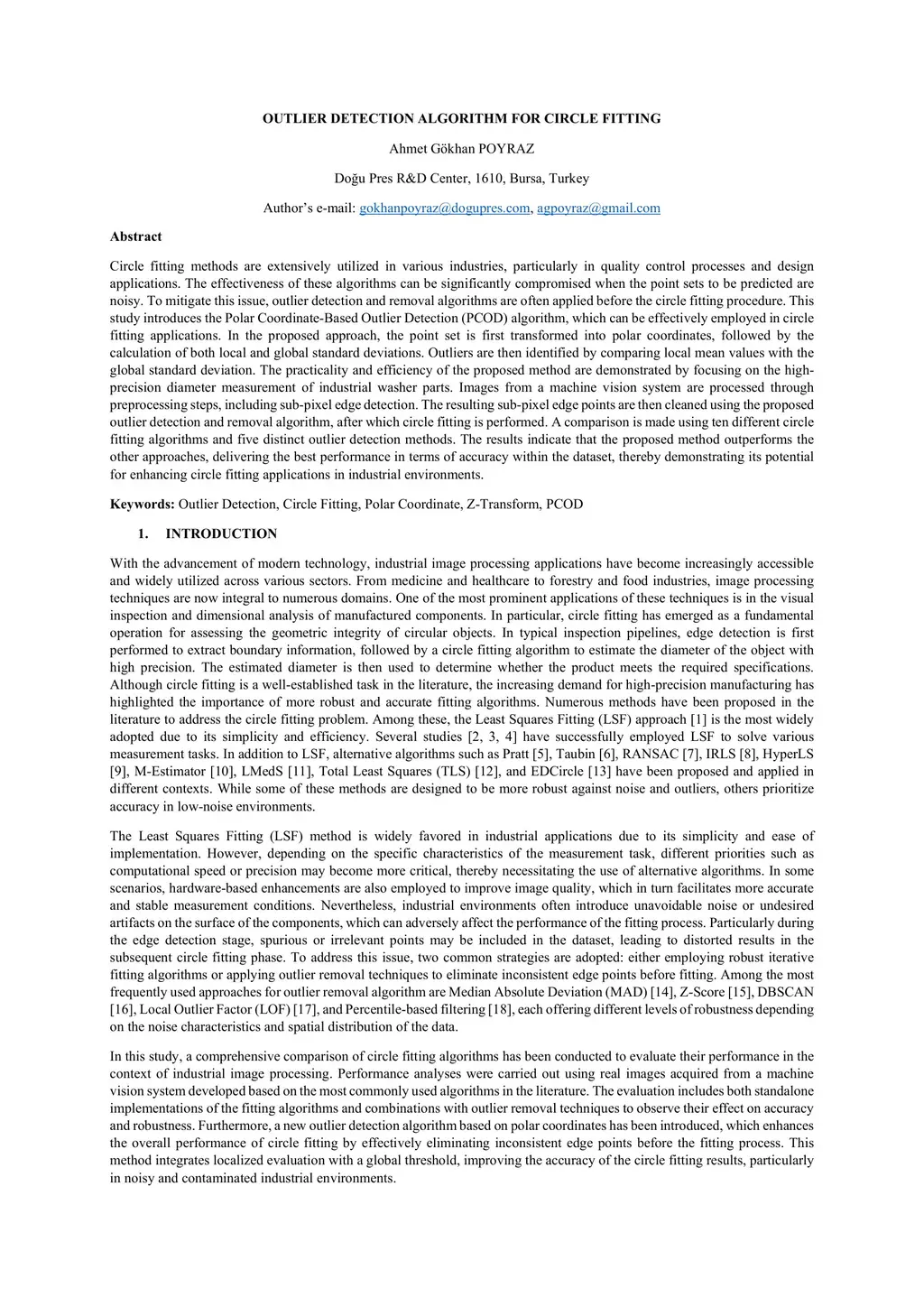 Circle fitting methods are extensively utilized in various industries, particularly in quality control processes and design applications. The effectiveness of these algorithms can be significantly compromised when the point sets to be predicted are noisy. To mitigate this issue, outlier detection and removal algorithms are often applied before the circle fitting procedure. This study introduces the Polar Coordinate-Based Outlier Detection (PCOD) algorithm, which can be effectively employed in circle fitting applications. In the proposed approach, the point set is first transformed into polar coordinates, followed by the calculation of both local and global standard deviations. Outliers are then identified by comparing local mean values with the global standard deviation. The practicality and efficiency of the proposed method are demonstrated by focusing on the high-precision diameter measurement of industrial washer parts. Images from a machine vision system are processed through preprocessing steps, including sub-pixel edge detection. The resulting sub-pixel edge points are then cleaned using the proposed outlier detection and removal algorithm, after which circle fitting is performed. A comparison is made using ten different circle fitting algorithms and five distinct outlier detection methods. The results indicate that the proposed method outperforms the other approaches, delivering the best performance in terms of accuracy within the dataset, thereby demonstrating its potential for enhancing circle fitting applications in industrial environments.