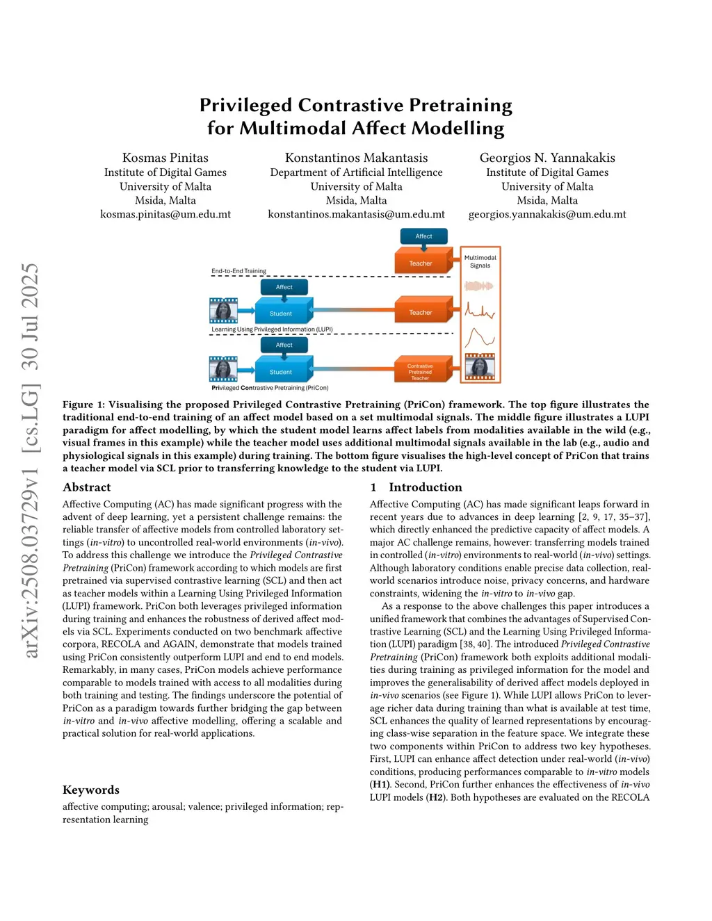 Affective Computing (AC) has made significant progress with the advent of deep learning, yet a persistent challenge remains: the reliable transfer of affective models from controlled laboratory settings (in-vitro) to uncontrolled real-world environments (in-vivo). To address this challenge we introduce the Privileged Contrastive Pretraining (PriCon) framework according to which models are first pretrained via supervised contrastive learning (SCL) and then act as teacher models within a Learning Using Privileged Information (LUPI) framework. PriCon both leverages privileged information during training and enhances the robustness of derived affect models via SCL. Experiments conducted on two benchmark affective corpora, RECOLA and AGAIN, demonstrate that models trained using PriCon consistently outperform LUPI and end to end models. Remarkably, in many cases, PriCon models achieve performance comparable to models trained with access to all modalities during both training and testing. The findings underscore the potential of PriCon as a paradigm towards further bridging the gap between in-vitro and in-vivo affective modelling, offering a scalable and practical solution for real-world applications.