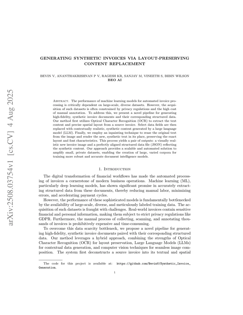 The performance of machine learning models for automated invoice processing is critically dependent on large-scale, diverse datasets. However, the acquisition of such datasets is often constrained by privacy regulations and the high cost of manual annotation. To address this, we present a novel pipeline for generating high-fidelity, synthetic invoice documents and their corresponding structured data. Our method first utilizes Optical Character Recognition (OCR) to extract the text content and precise spatial layout from a source invoice. Select data fields are then replaced with contextually realistic, synthetic content generated by a large language model (LLM). Finally, we employ an inpainting technique to erase the original text from the image and render the new, synthetic text in its place, preserving the exact layout and font characteristics. This process yields a pair of outputs: a visually realistic new invoice image and a perfectly aligned structured data file (JSON) reflecting the synthetic content. Our approach provides a scalable and automated solution to amplify small, private datasets, enabling the creation of large, varied corpora for training more robust and accurate document intelligence models.
