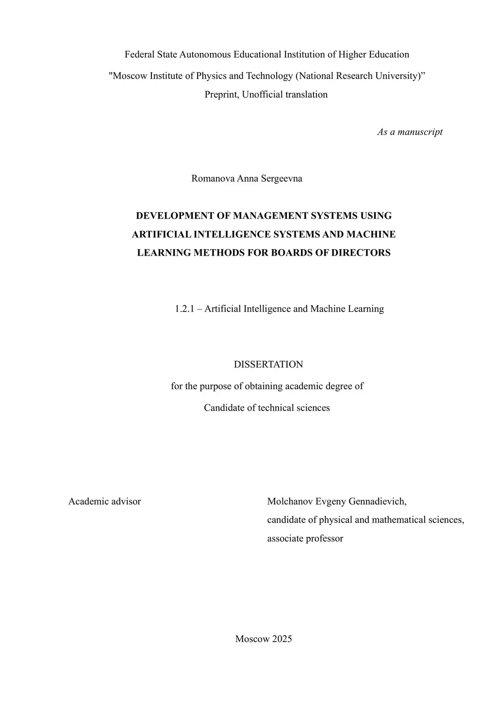 Development of management systems using artificial intelligence systems and machine learning methods for boards of directors (preprint, unofficial translation)