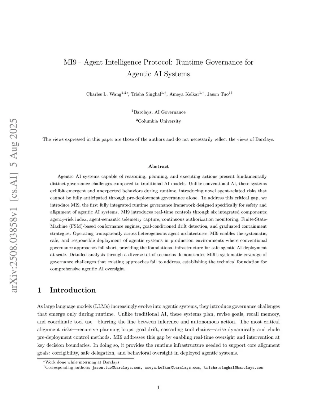 Agentic AI systems capable of reasoning, planning, and executing actions present fundamentally distinct governance challenges compared to traditional AI models. Unlike conventional AI, these systems exhibit emergent and unexpected behaviors during runtime, introducing novel agent-related risks that cannot be fully anticipated through pre-deployment governance alone. To address this critical gap, we introduce MI9, the first fully integrated runtime governance framework designed specifically for safety and alignment of agentic AI systems. MI9 introduces real-time controls through six integrated components: agency-risk index, agent-semantic telemetry capture, continuous authorization monitoring, Finite-State-Machine (FSM)-based conformance engines, goal-conditioned drift detection, and graduated containment strategies. Operating transparently across heterogeneous agent architectures, MI9 enables the systematic, safe, and responsible deployment of agentic systems in production environments where conventional governance approaches fall short, providing the foundational infrastructure for safe agentic AI deployment at scale. Detailed analysis through a diverse set of scenarios demonstrates MI9's systematic coverage of governance challenges that existing approaches fail to address, establishing the technical foundation for comprehensive agentic AI oversight.