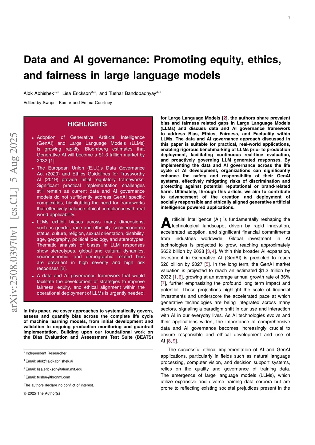 Data and AI governance: Promoting equity, ethics, and fairness in large language models