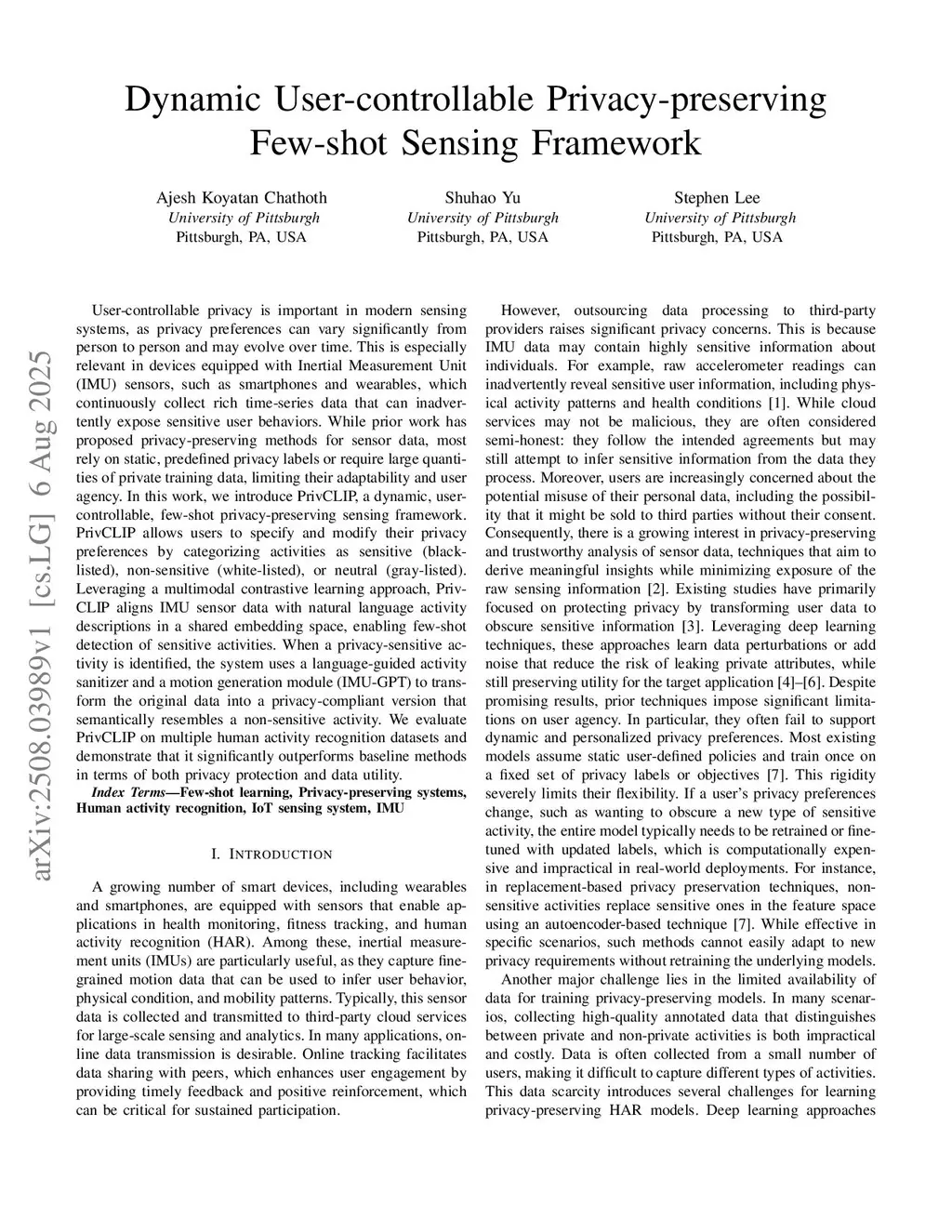 User-controllable privacy is important in modern sensing systems, as privacy preferences can vary significantly from person to person and may evolve over time. This is especially relevant in devices equipped with Inertial Measurement Unit (IMU) sensors, such as smartphones and wearables, which continuously collect rich time-series data that can inadvertently expose sensitive user behaviors. While prior work has proposed privacy-preserving methods for sensor data, most rely on static, predefined privacy labels or require large quantities of private training data, limiting their adaptability and user agency. In this work, we introduce PrivCLIP, a dynamic, user-controllable, few-shot privacy-preserving sensing framework. PrivCLIP allows users to specify and modify their privacy preferences by categorizing activities as sensitive (black-listed), non-sensitive (white-listed), or neutral (gray-listed). Leveraging a multimodal contrastive learning approach, PrivCLIP aligns IMU sensor data with natural language activity descriptions in a shared embedding space, enabling few-shot detection of sensitive activities. When a privacy-sensitive activity is identified, the system uses a language-guided activity sanitizer and a motion generation module (IMU-GPT) to transform the original data into a privacy-compliant version that semantically resembles a non-sensitive activity. We evaluate PrivCLIP on multiple human activity recognition datasets and demonstrate that it significantly outperforms baseline methods in terms of both privacy protection and data utility.