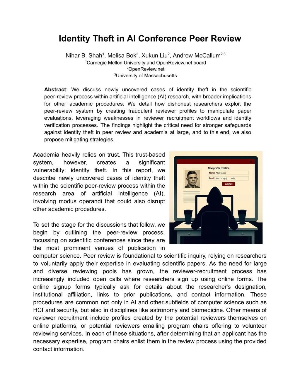 We discuss newly uncovered cases of identity theft in the scientific peer-review process within artificial intelligence (AI) research, with broader implications for other academic procedures. We detail how dishonest researchers exploit the peer-review system by creating fraudulent reviewer profiles to manipulate paper evaluations, leveraging weaknesses in reviewer recruitment workflows and identity verification processes. The findings highlight the critical need for stronger safeguards against identity theft in peer review and academia at large, and to this end, we also propose mitigating strategies.