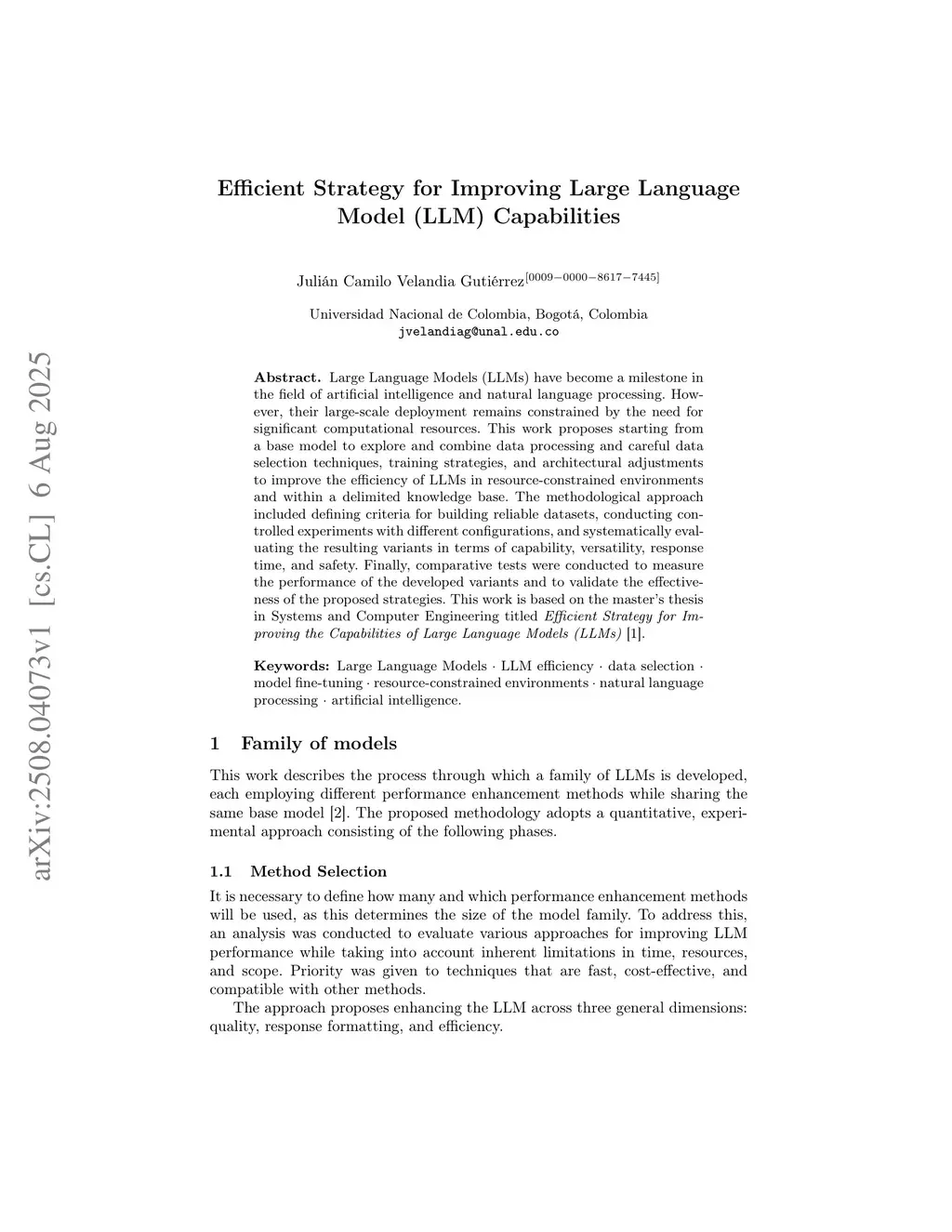 Large Language Models (LLMs) have become a milestone in the field of artificial intelligence and natural language processing. However, their large-scale deployment remains constrained by the need for significant computational resources. This work proposes starting from a base model to explore and combine data processing and careful data selection techniques, training strategies, and architectural adjustments to improve the efficiency of LLMs in resource-constrained environments and within a delimited knowledge base. The methodological approach included defining criteria for building reliable datasets, conducting controlled experiments with different configurations, and systematically evaluating the resulting variants in terms of capability, versatility, response time, and safety. Finally, comparative tests were conducted to measure the performance of the developed variants and to validate the effectiveness of the proposed strategies. This work is based on the master's thesis in Systems and Computer Engineering titled "Efficient Strategy for Improving the Capabilities of Large Language Models (LLMs)".