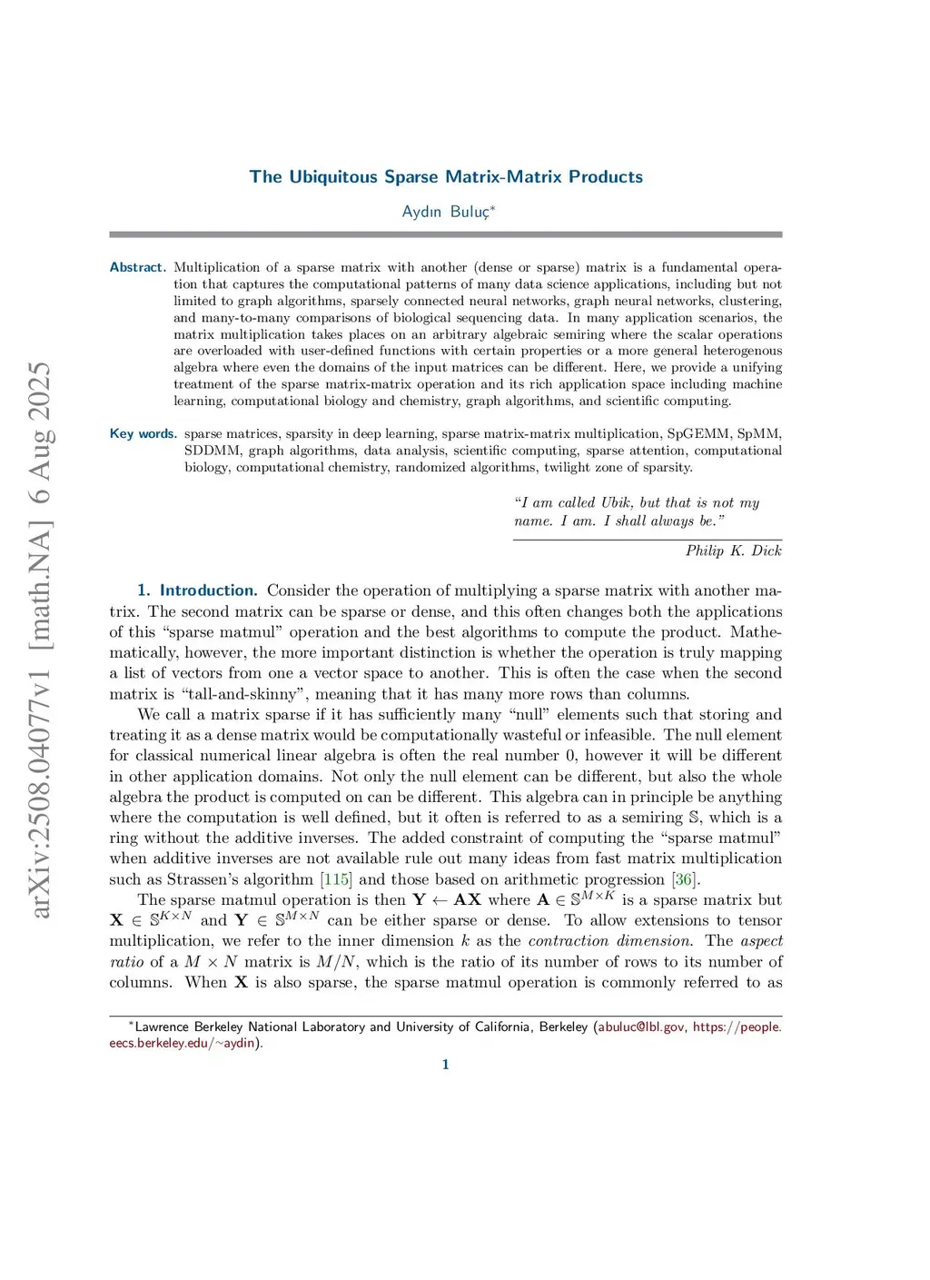 Multiplication of a sparse matrix with another (dense or sparse) matrix is a fundamental operation that captures the computational patterns of many data science applications, including but not limited to graph algorithms, sparsely connected neural networks, graph neural networks, clustering, and many-to-many comparisons of biological sequencing data.In many application scenarios, the matrix multiplication takes places on an arbitrary algebraic semiring where the scalar operations are overloaded with user-defined functions with certain properties or a more general heterogenous algebra where even the domains of the input matrices can be different. Here, we provide a unifying treatment of the sparse matrix-matrix operation and its rich application space including machine learning, computational biology and chemistry, graph algorithms, and scientific computing.