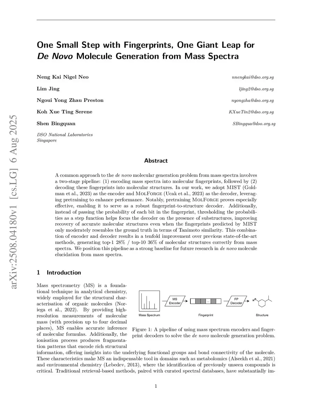 A common approach to the de novo molecular generation problem from mass spectra involves a two-stage pipeline: (1) encoding mass spectra into molecular fingerprints, followed by (2) decoding these fingerprints into molecular structures. In our work, we adopt MIST (Goldman et. al., 2023) as the encoder and MolForge (Ucak et. al., 2023) as the decoder, leveraging additional training data to enhance performance. We also threshold the probabilities of each fingerprint bit to focus on the presence of substructures. This results in a tenfold improvement over previous state-of-the-art methods, generating top-1 31% / top-10 40% of molecular structures correctly from mass spectra in MassSpecGym (Bushuiev et. al., 2024). We position this as a strong baseline for future research in de novo molecule elucidation from mass spectra.