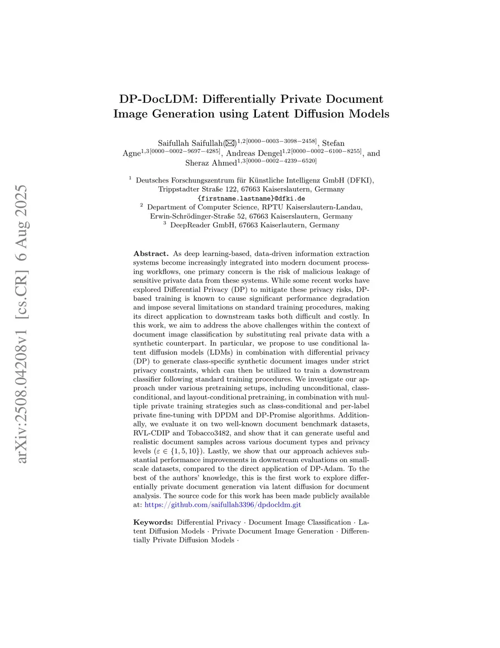 As deep learning-based, data-driven information extraction systems become increasingly integrated into modern document processing workflows, one primary concern is the risk of malicious leakage of sensitive private data from these systems. While some recent works have explored Differential Privacy (DP) to mitigate these privacy risks, DP-based training is known to cause significant performance degradation and impose several limitations on standard training procedures, making its direct application to downstream tasks both difficult and costly. In this work, we aim to address the above challenges within the context of document image classification by substituting real private data with a synthetic counterpart. In particular, we propose to use conditional latent diffusion models (LDMs) in combination with differential privacy (DP) to generate class-specific synthetic document images under strict privacy constraints, which can then be utilized to train a downstream classifier following standard training procedures. We investigate our approach under various pretraining setups, including unconditional, class-conditional, and layout-conditional pretraining, in combination with multiple private training strategies such as class-conditional and per-label private fine-tuning with DPDM and DP-Promise algorithms. Additionally, we evaluate it on two well-known document benchmark datasets, RVL-CDIP and Tobacco3482, and show that it can generate useful and realistic document samples across various document types and privacy levels (). Lastly, we show that our approach achieves substantial performance improvements in downstream evaluations on small-scale datasets, compared to the direct application of DP-Adam.