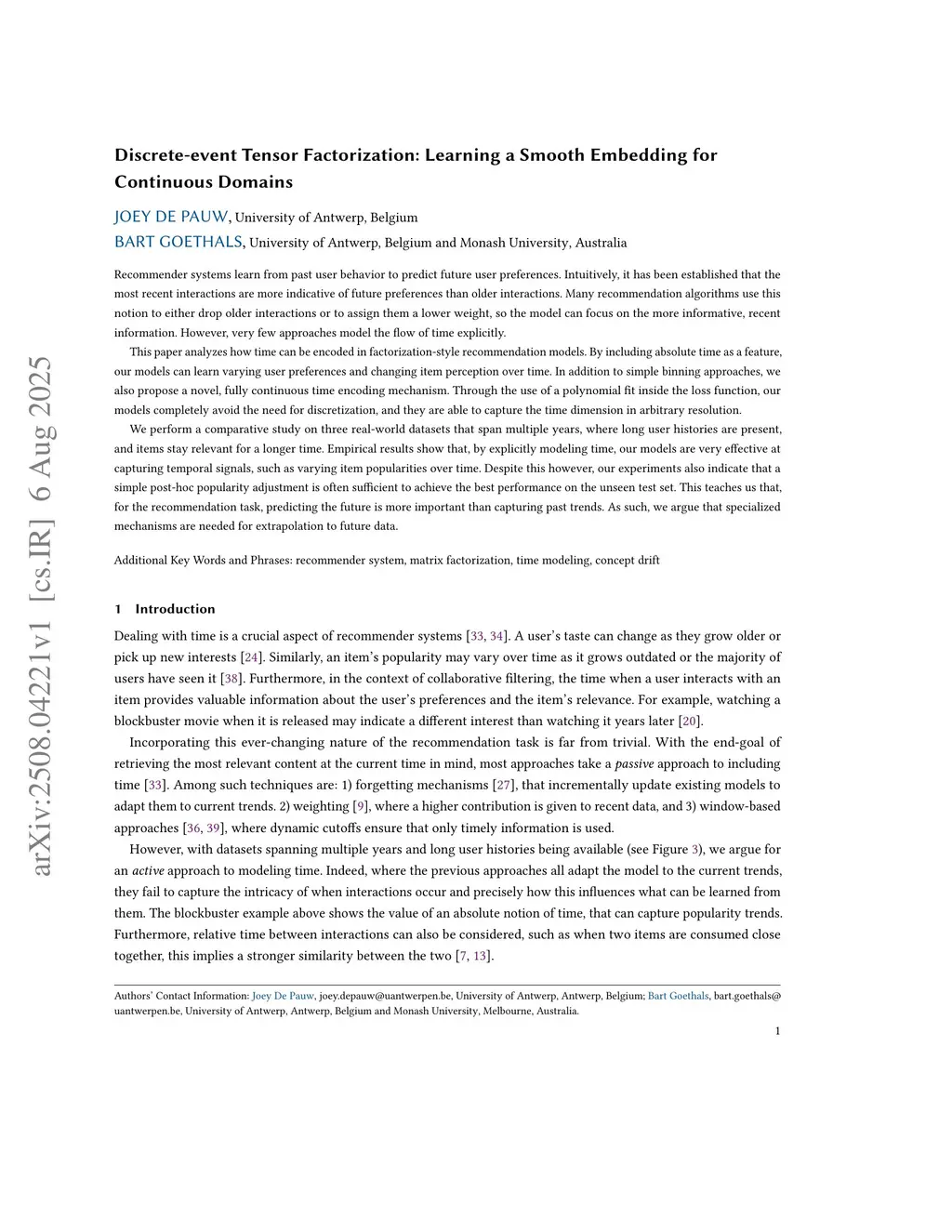 Discrete-event Tensor Factorization: Learning a Smooth Embedding for Continuous Domains